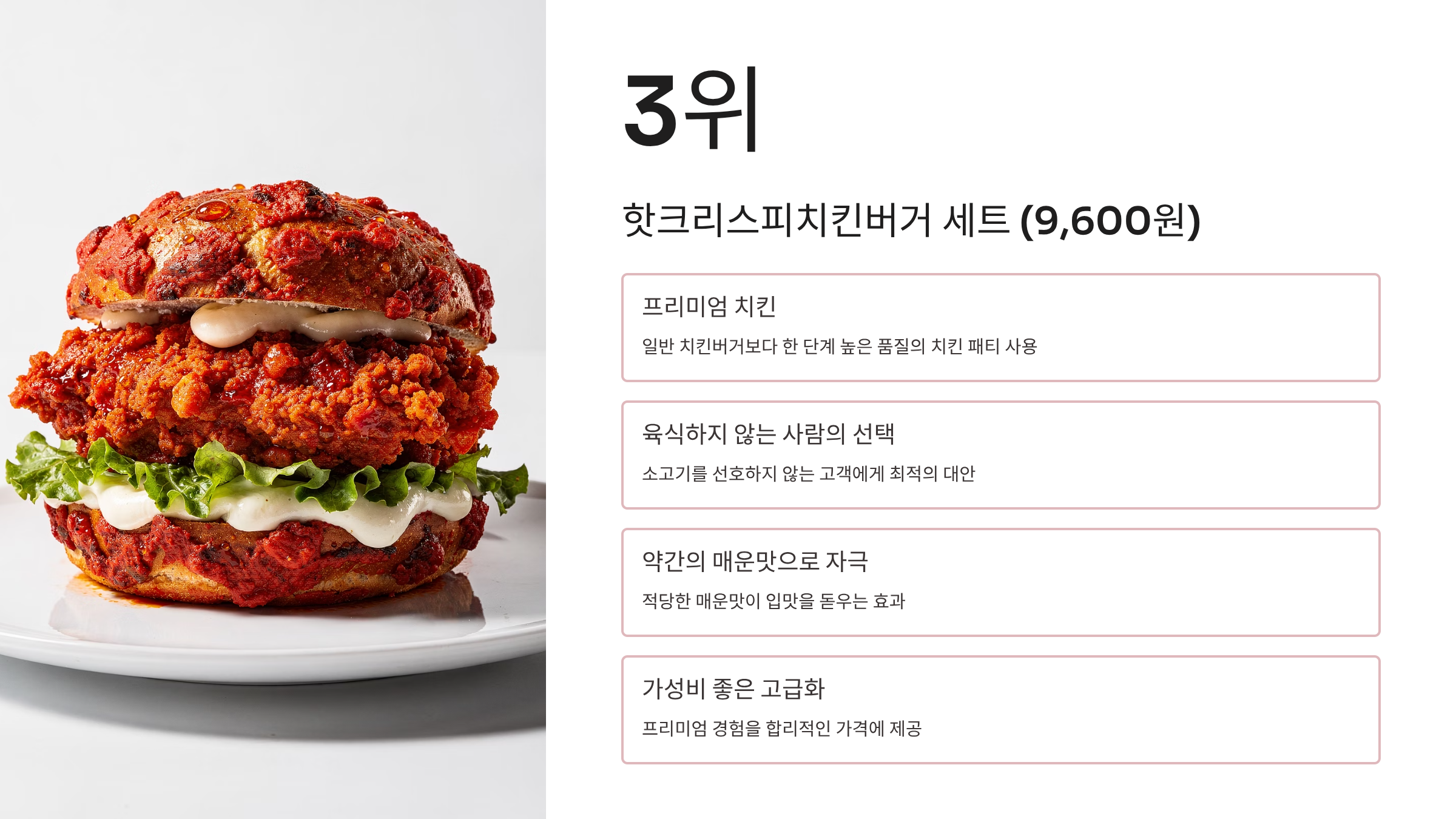 3위: 핫크리스피치킨버거 세트 (9,600원)
