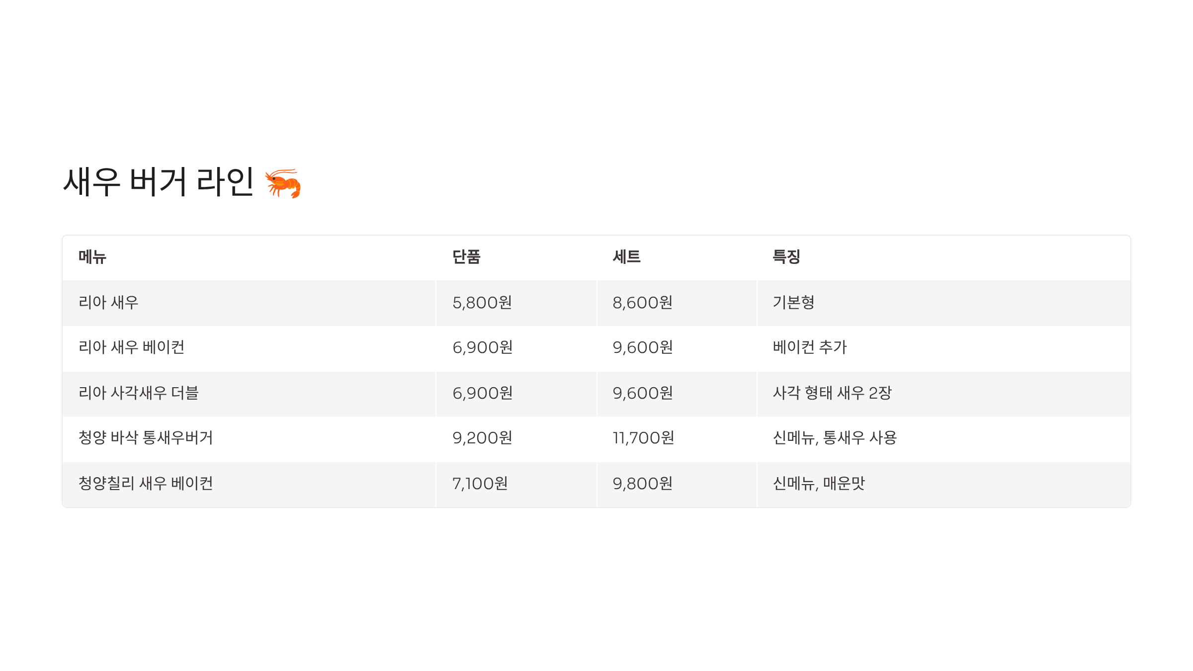 | 청양 바삭 통새우버거 | 9,200원 | 11,700원 | 신메뉴, 통새우 사용 |