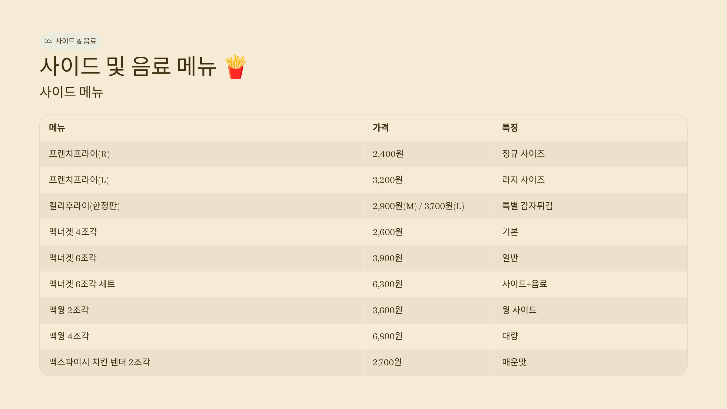| 맥너겟 4조각 | 2,600원 | 사이드 |