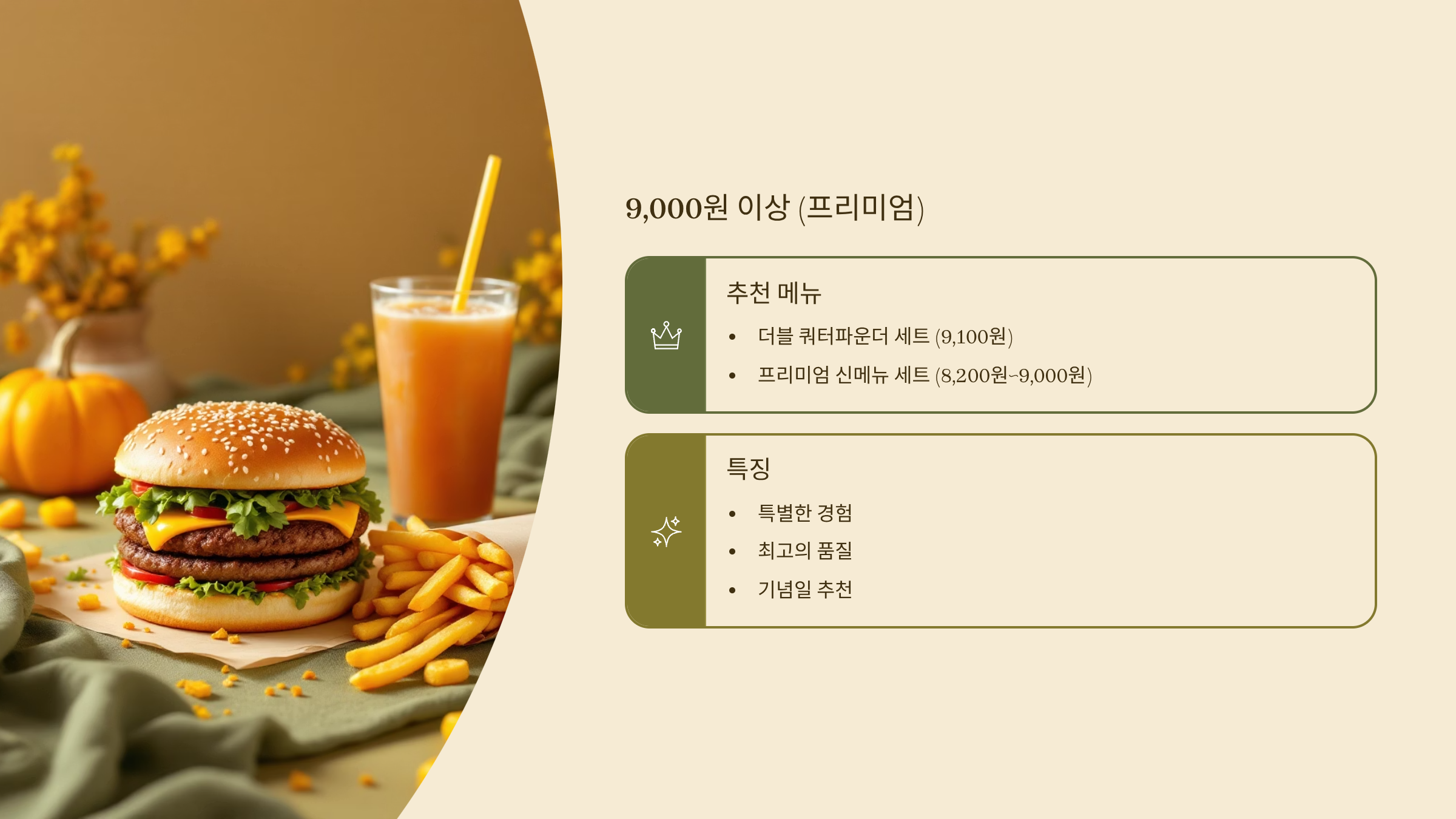 2025년부터 맥도날드는 프리미엄화 전략으로 쿼터파운더 시리즈, 크리스피 버거, 프리미엄 소스 등을 강화했습니다. 동시에 해피스낵(2,600원부터), 행운버거 세트(4,900원) 같은 저가 옵션도 유지하고 있습니다.