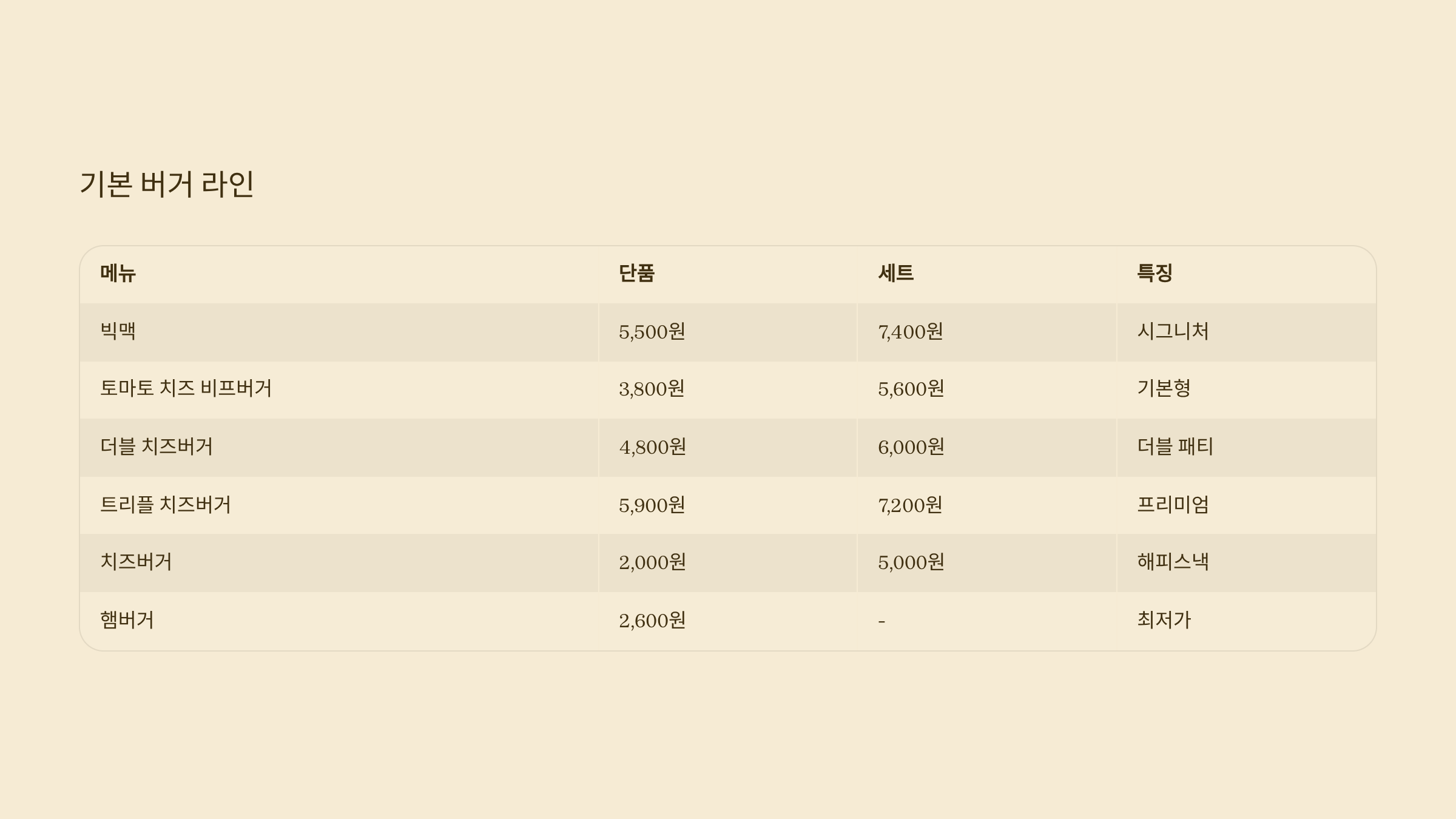 | 쿼터파운더 치즈 | 5,500원 | 7,600원 | 8,400원 | 프리미엄 싱글 |