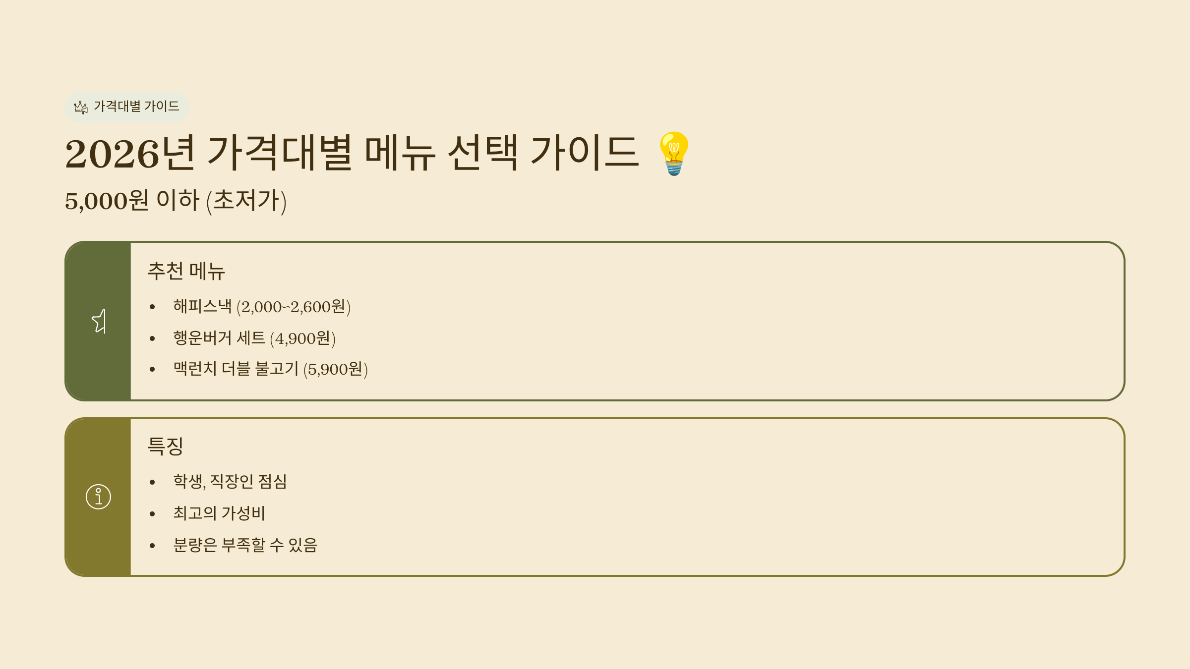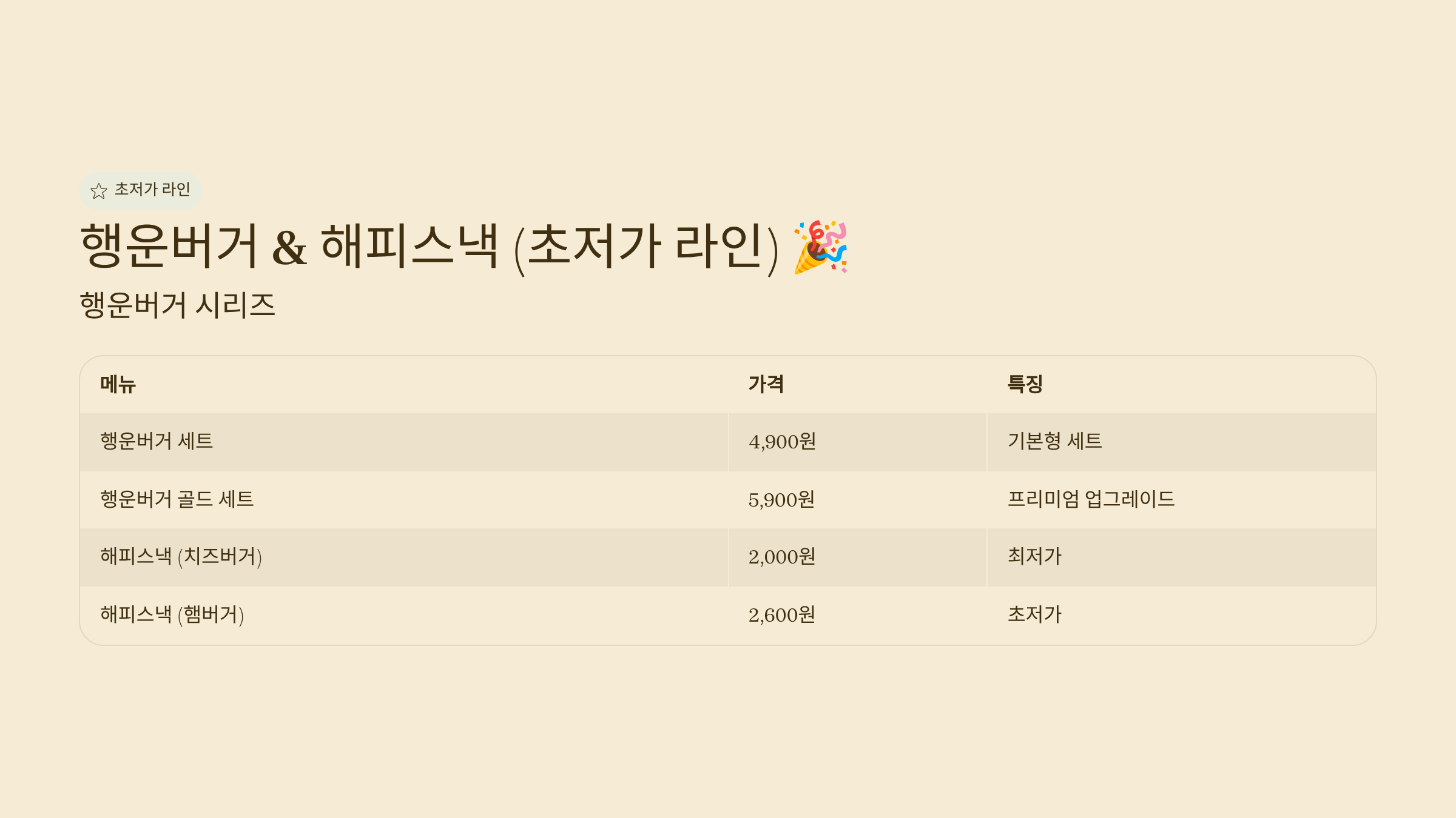 ✅ 초저가 옵션 유지 (행운버거, 해피스낵)