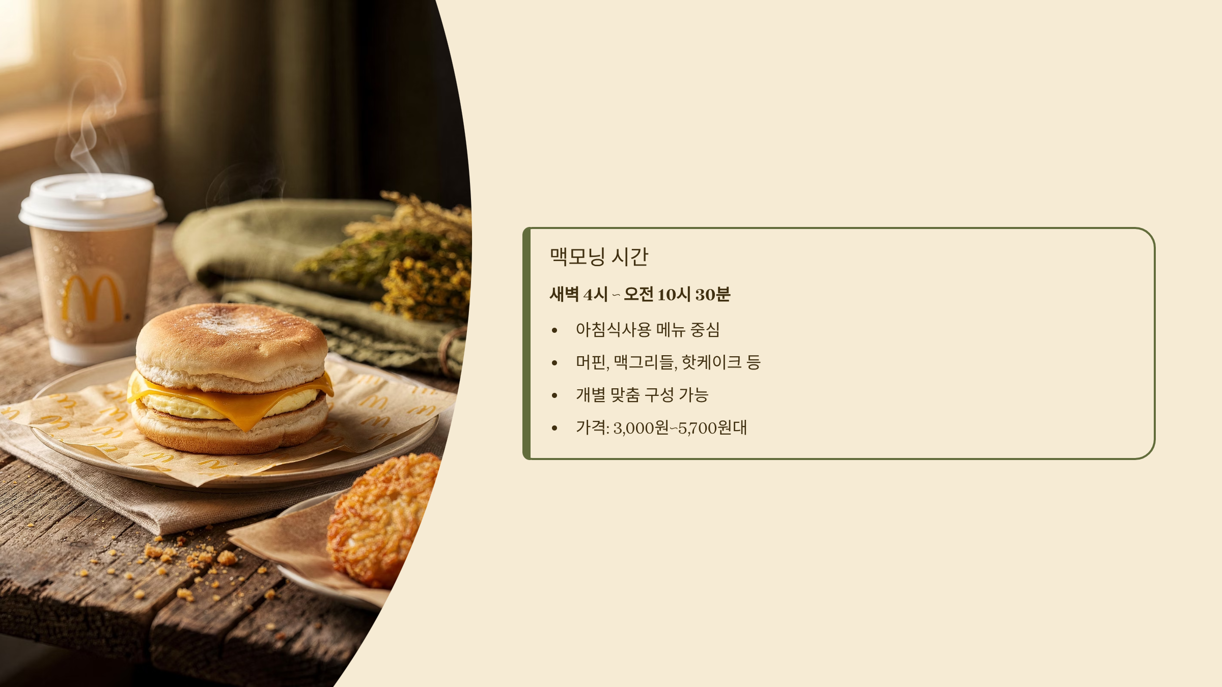 - 맥모닝 메뉴: 3,000원~5,700원대 (새벽 4시~오전 10시 30분)