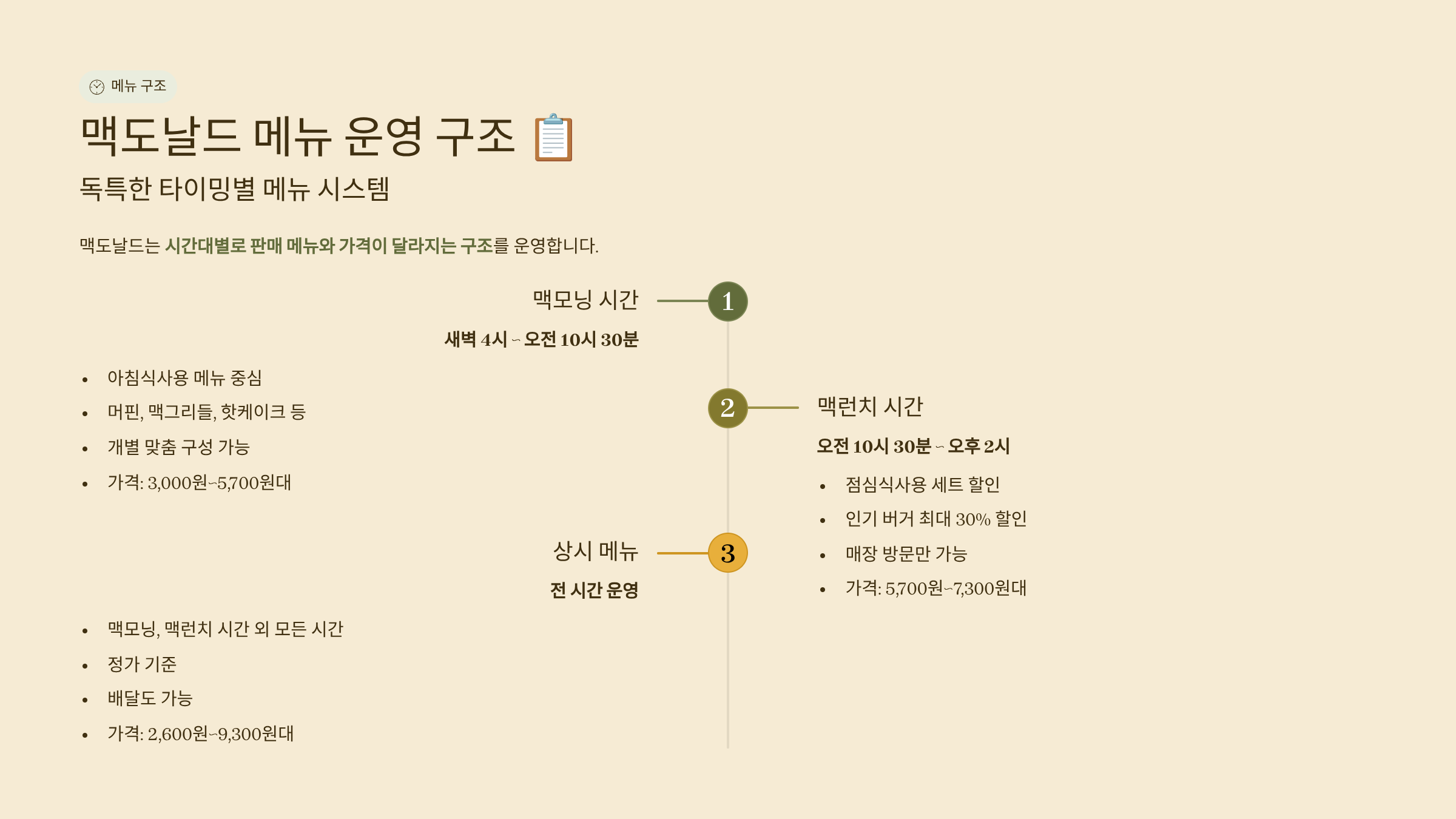 특히 맥도날드는 맥모닝, 맥런치, 상시 메뉴라는 타이밍별 메뉴 운영으로 새벽부터 밤까지 서로 다른 메뉴와 가격을 제공합니다. 이는 다른 프랜차이즈에 비해 독특한 구조이며, 이를 잘 이해하면 최대 30% 이상 절감할 수 있습니다.