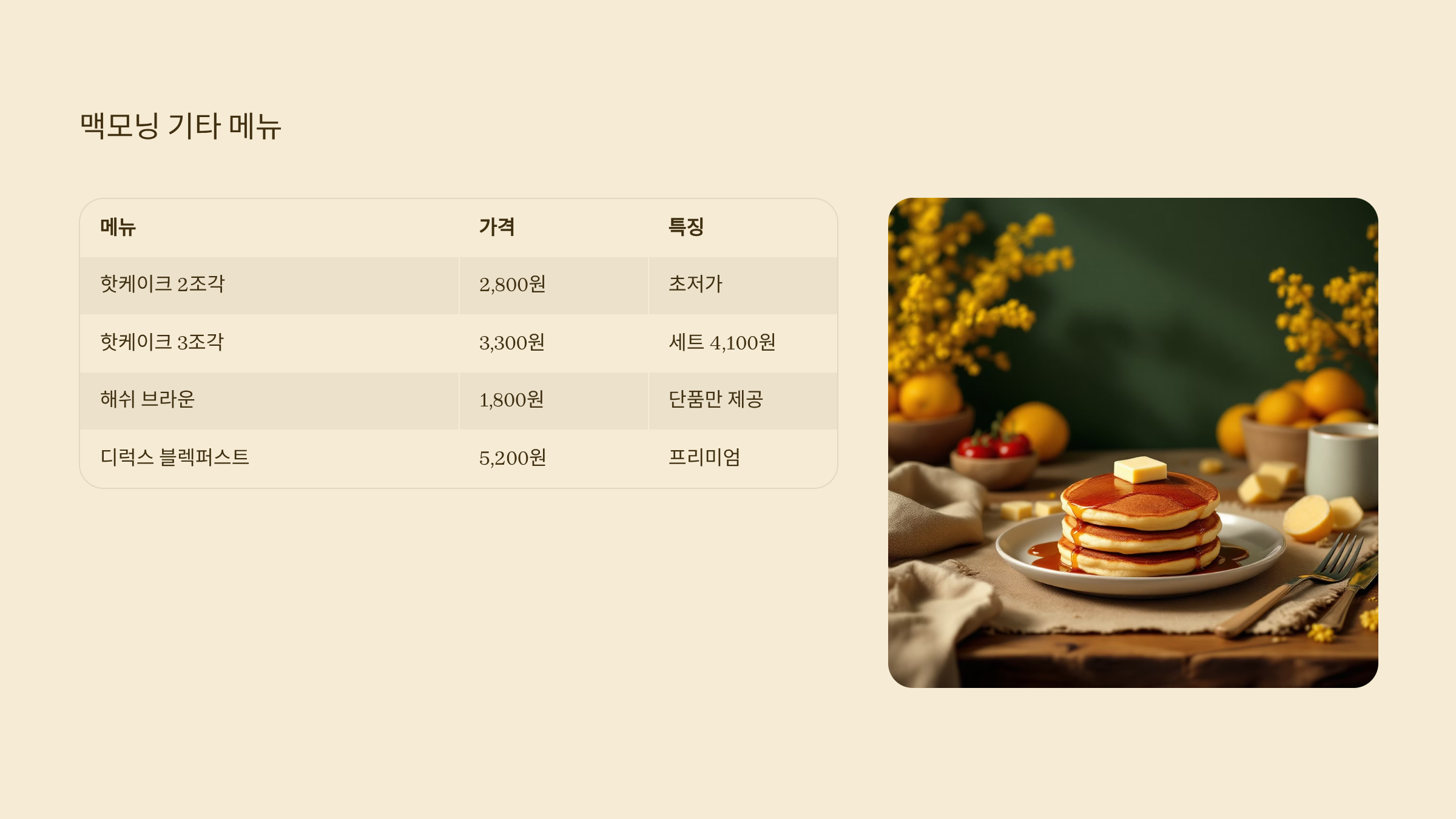 | 핫케이크 3조각 | 3,300원 | 세트 4,100원 |