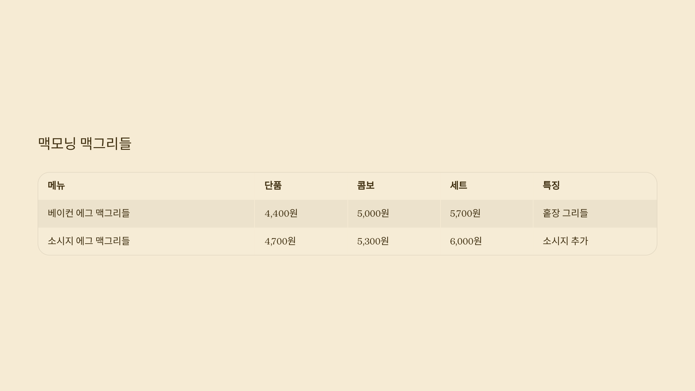 | 소시지 에그 맥그리들 | 4,700원 | 5,300원 | 6,000원 | 소시지 추가 |