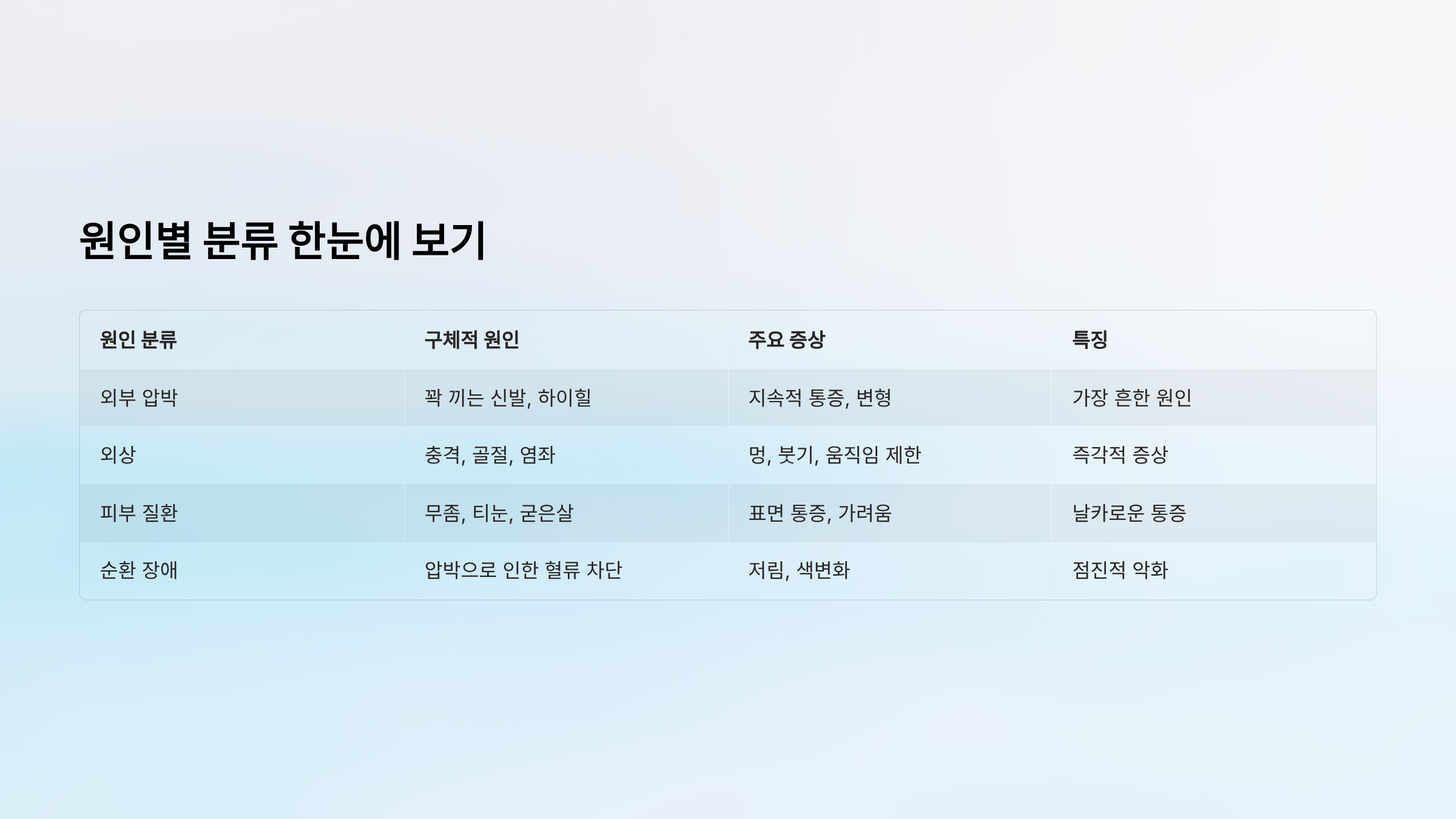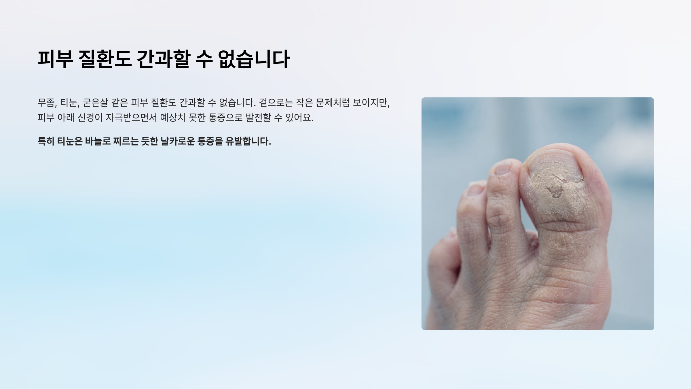 | 피부 질환 | 무좀, 티눈, 굳은살 | 표면 통증, 가려움 |