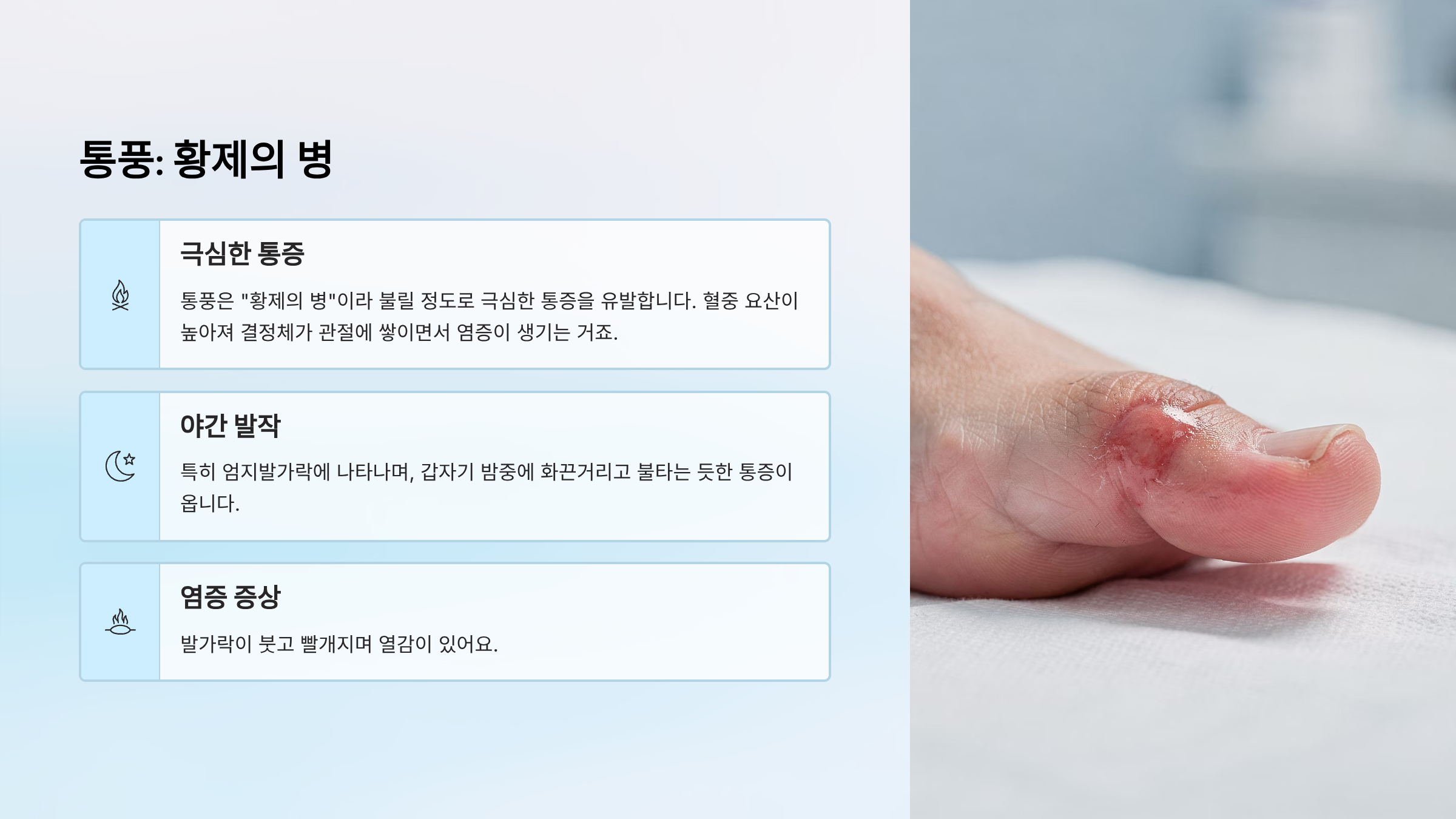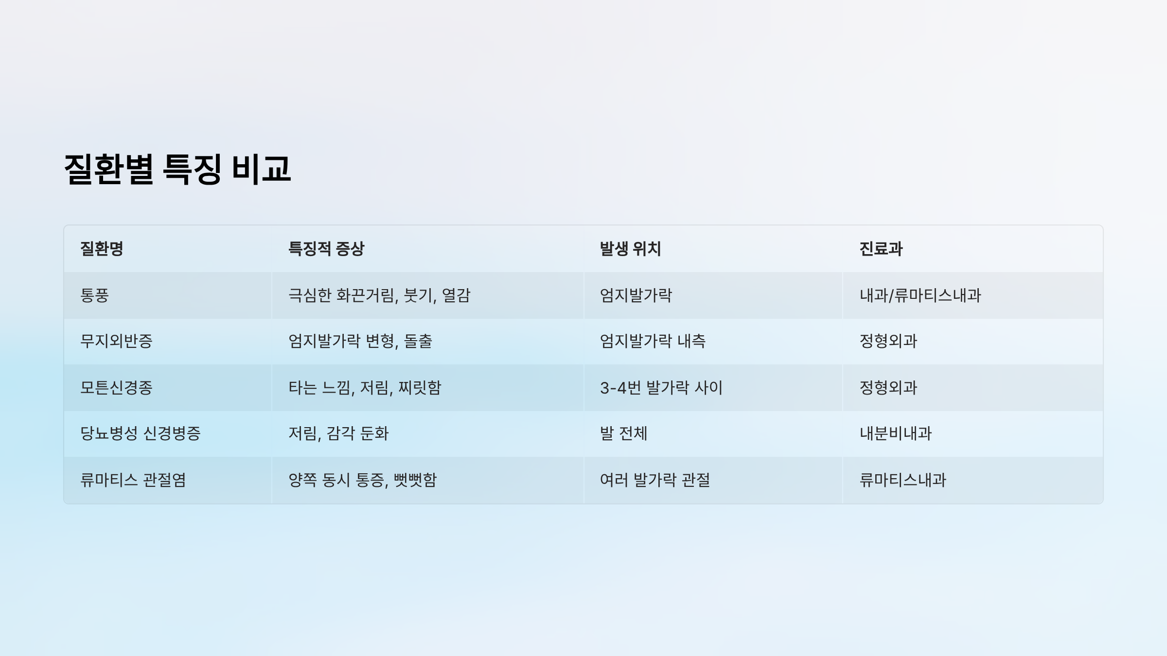 | 통풍 | 극심한 화끈거림, 붓기, 열감 | 엄지발가락 | 내과/류마티스내과 |