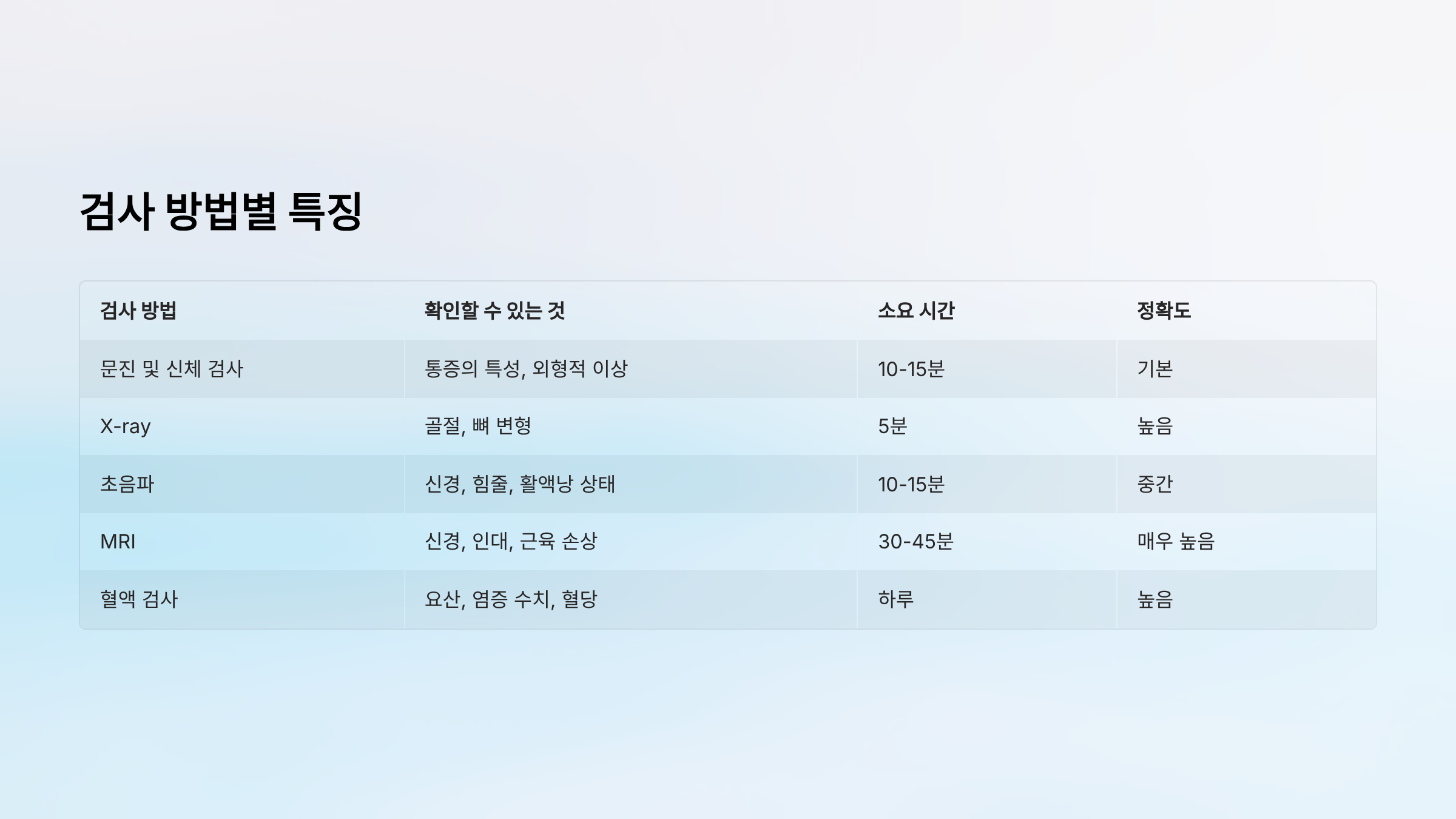 | 문진 및 신체 검사 | 통증의 특성, 외형적 이상 | 10-15분 |