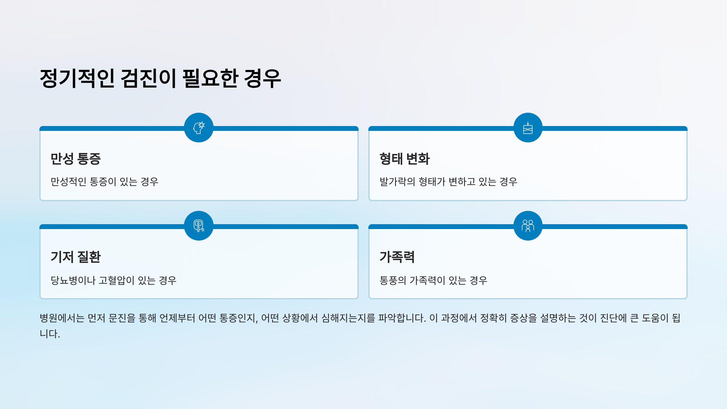 정기적인 검진이 필요한 경우도 있습니다. 만성적인 통증이 있는 경우, 발가락의 형태가 변하고 있는 경우, 당뇨병이나 고혈압이 있는 경우, 통풍의 가족력이 있는 경우 등이 해당돼요.