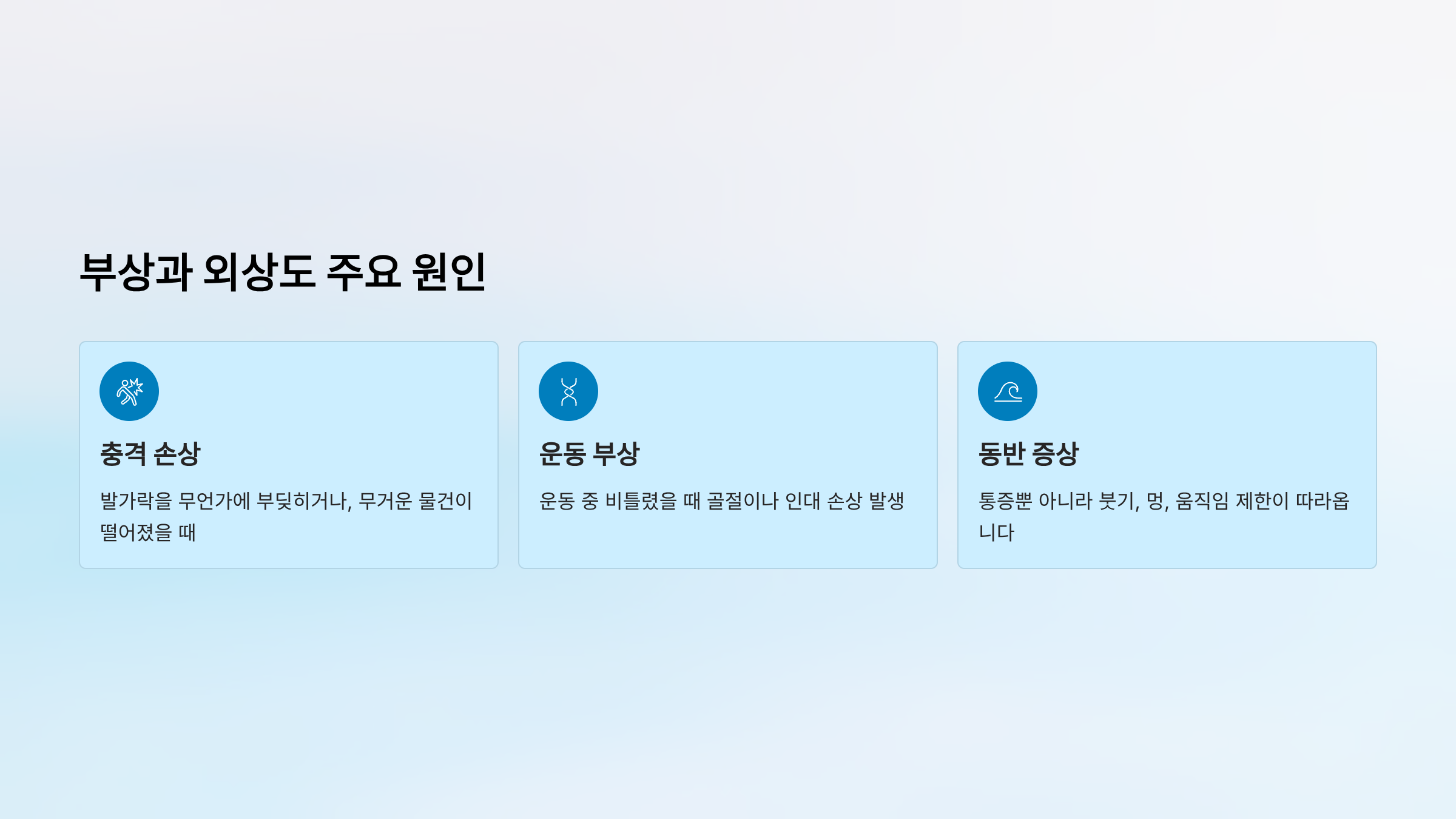 | 외상 | 충격, 골절, 염좌 | 멍, 붓기, 움직임 제한 |