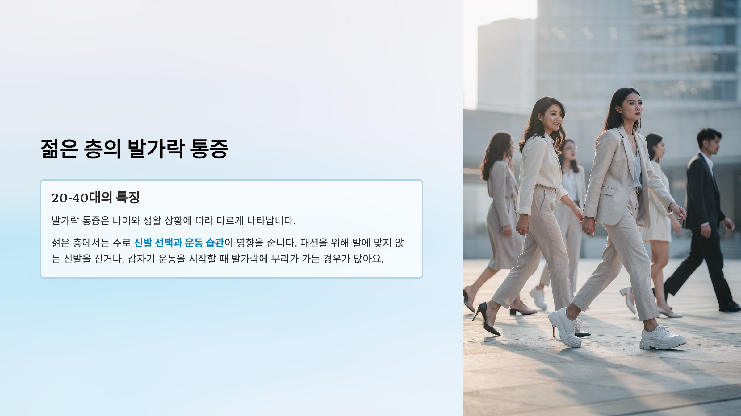 젊은 층(20-40대)에서는 주로 신발 선택과 운동 습관이 영향을 줍니다. 패션을 위해 발에 맞지 않는 신발을 신거나, 갑자기 운동을 시작할 때 발가락에 무리가 가는 경우가 많아요.