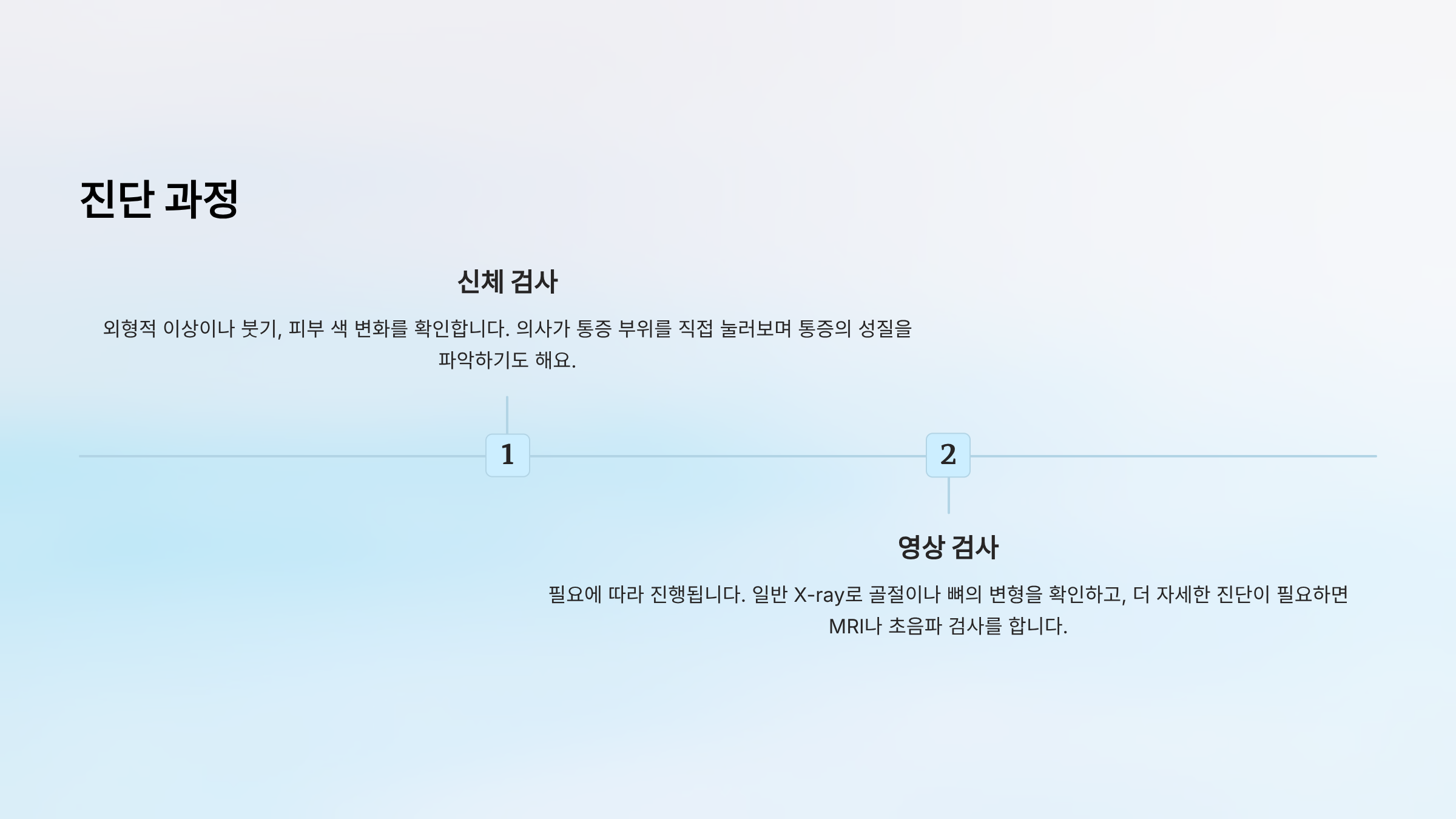 그 다음은 신체 검사로 외형적 이상이나 붓기, 피부 색 변화를 확인합니다. 의사가 통증 부위를 직접 눌러보며 통증의 성질을 파악하기도 해요.