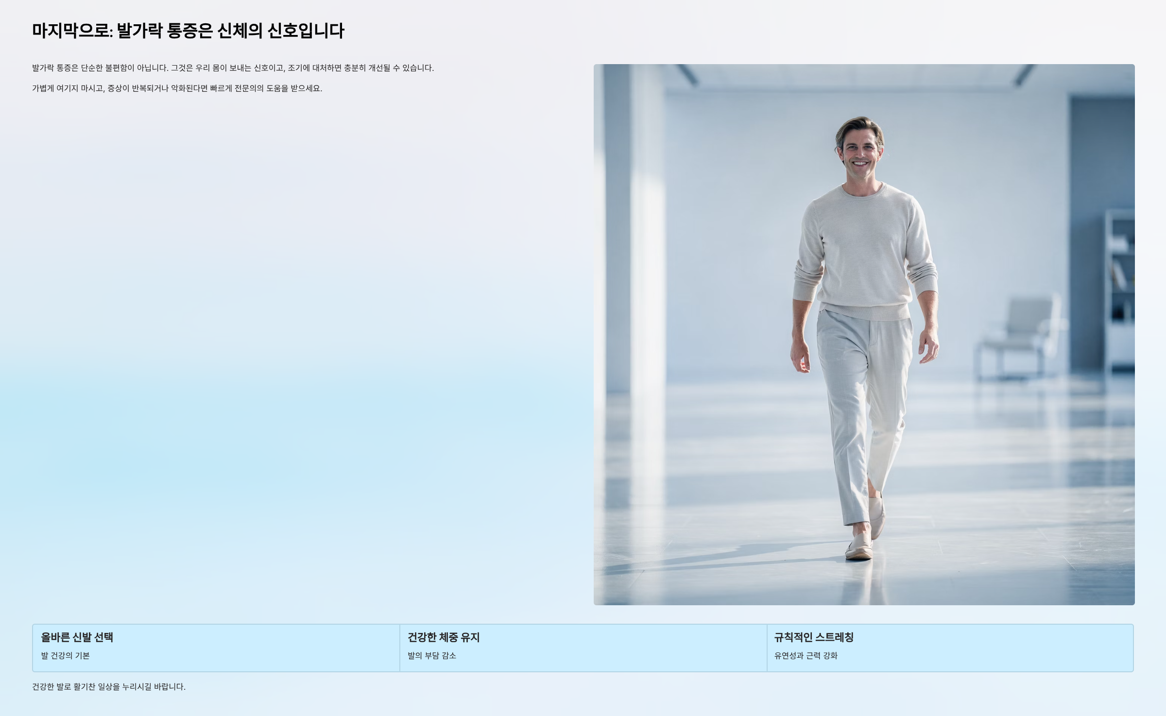 발가락 통증은 단순한 불편함이 아닙니다. 그것은 우리 몸이 보내는 신호이고, 조기에 대처하면 충분히 개선될 수 있습니다. 가볍게 여기지 마시고, 증상이 반복되거나 악화된다면 빠르게 전문의의 도움을 받으세요. 올바른 신발 선택, 건강한 체중 유지, 규칙적인 스트레칭은 발 건강을 지키는 가장 기본이자 가장 효과적인 방법입니다. 건강한 발로 활기찬 일상을 누리시길 바랍니다.