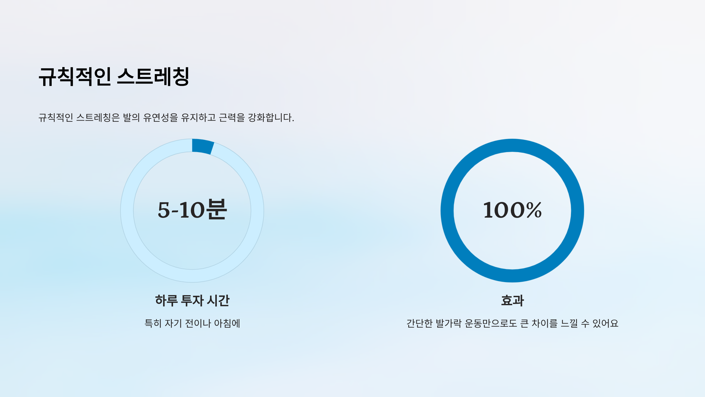 | 발가락 스트레칭 | 각 발가락 5-10초 당기기 | 3분 | 유연성 증대 |