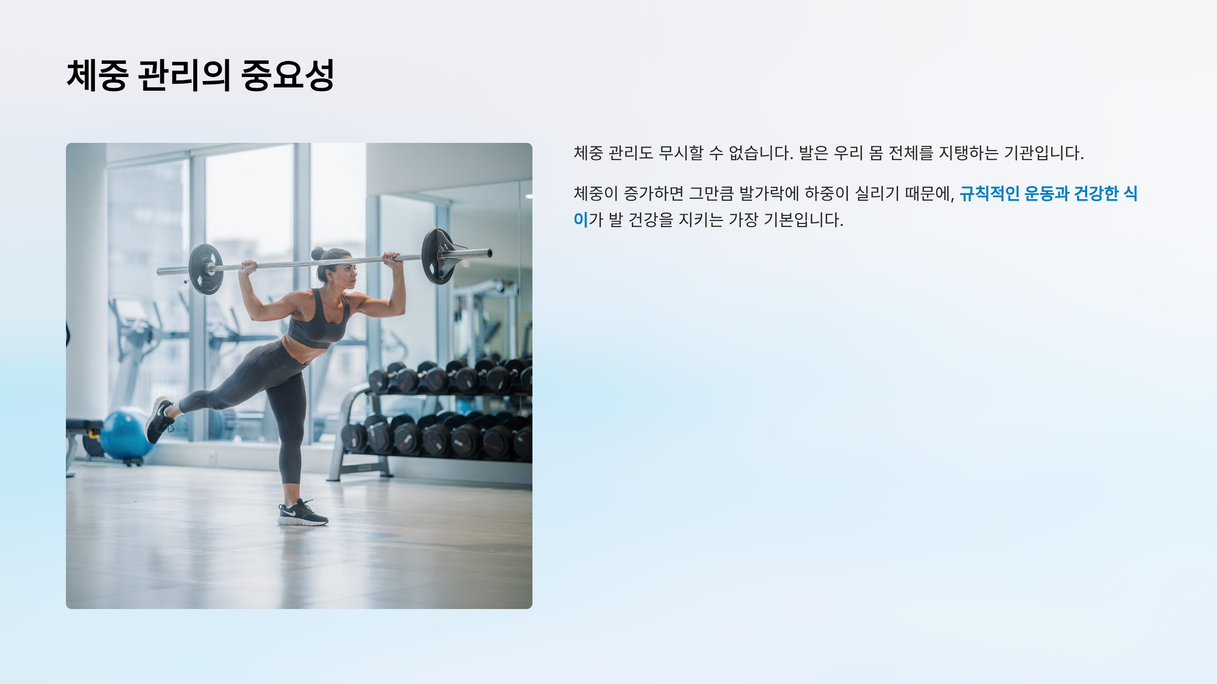 체중 관리도 무시할 수 없습니다. 발은 우리 몸 전체를 지탱하는 기관입니다. 체중이 증가하면 그만큼 발가락에 하중이 실리기 때문에, 규칙적인 운동과 건강한 식이가 발 건강을 지키는 가장 기본입니다.