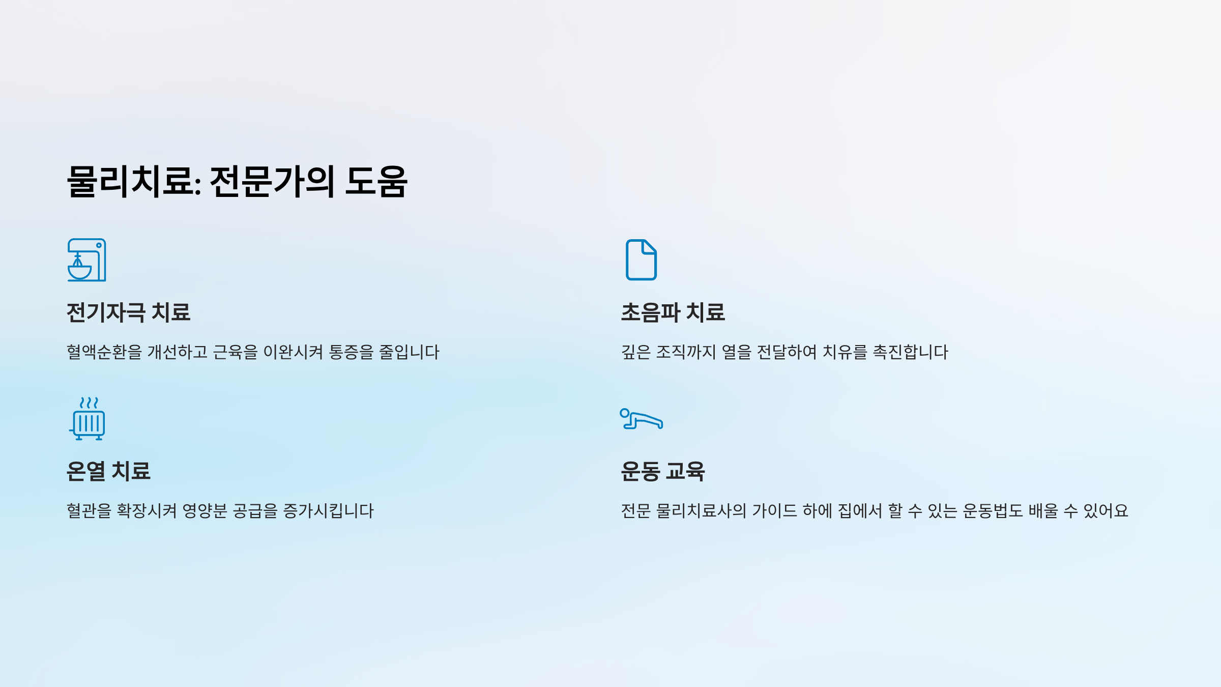 물리치료는 전문가의 도움을 받는 것이 좋습니다. 전기자극 치료, 초음파 치료, 온열 치료 등은 혈액순환을 개선하고 근육을 이완시켜 통증을 줄입니다. 전문 물리치료사의 가이드 하에 집에서 할 수 있는 운동법도 배울 수 있어요.