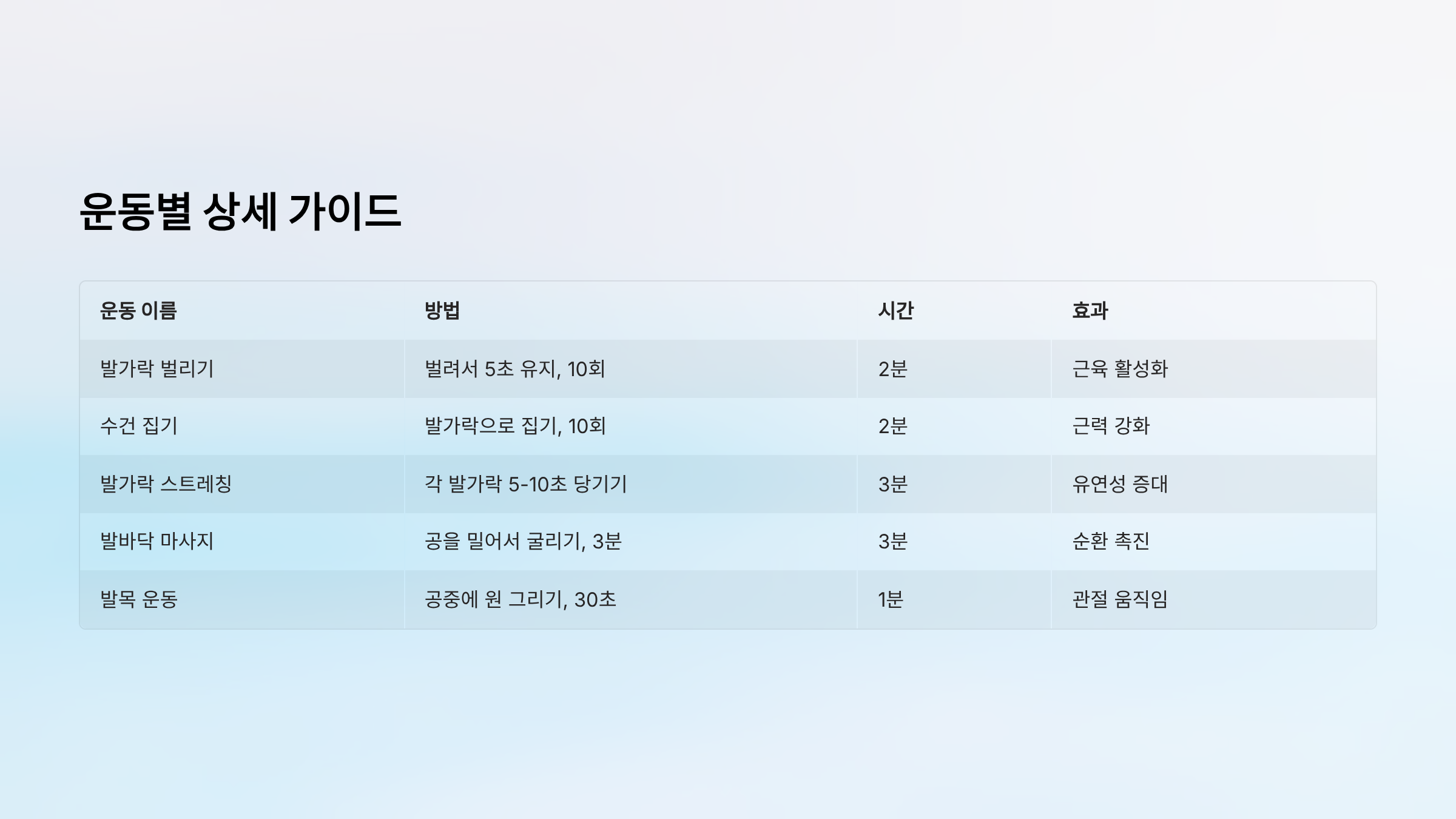 | 발가락 벌리기 | 벌려서 5초 유지, 10회 | 2분 | 근육 활성화 |