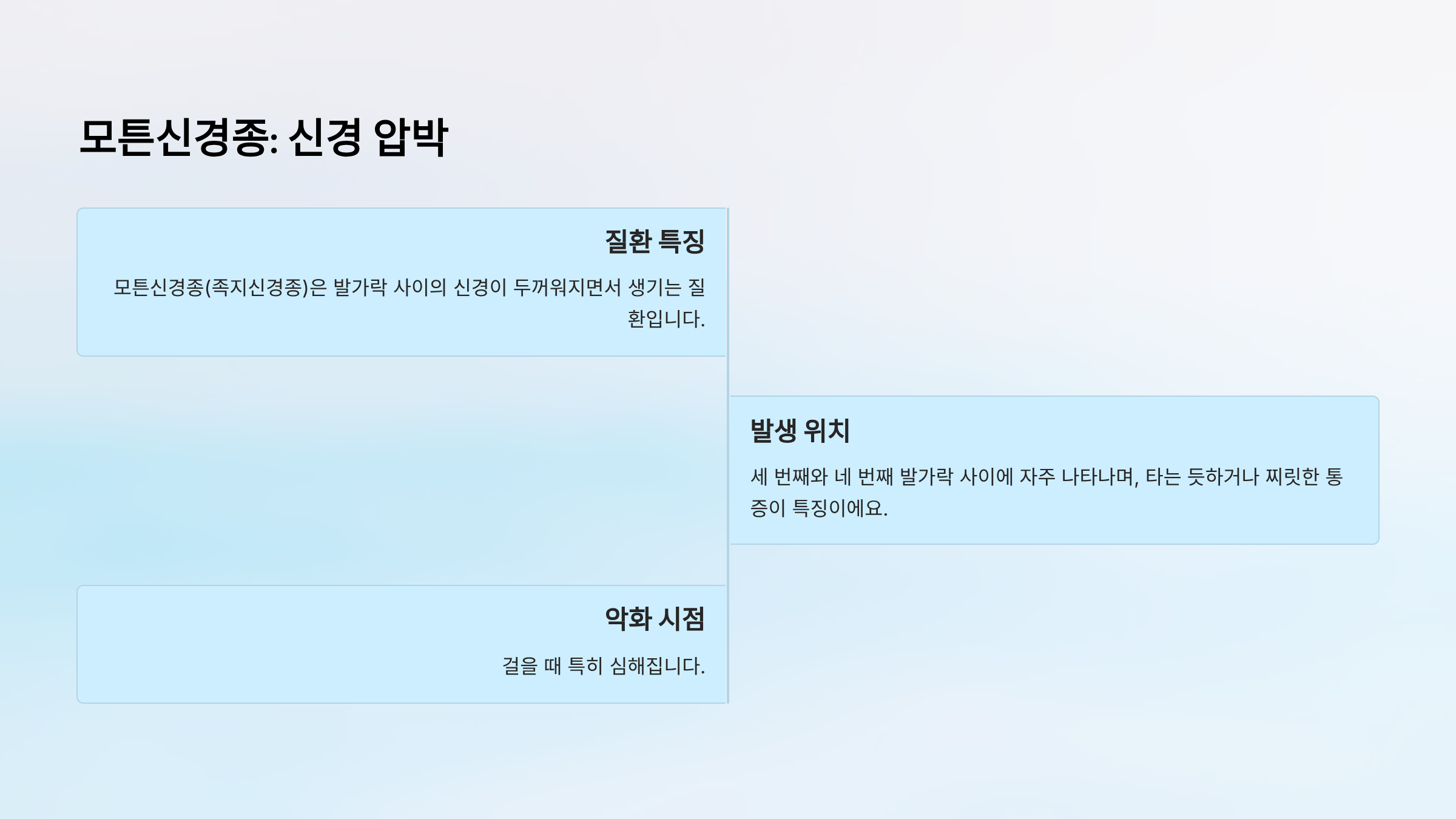 | 모튼신경종 | 타는 느낌, 저림, 찌릿함 | 3-4번 발가락 사이 | 정형외과 |