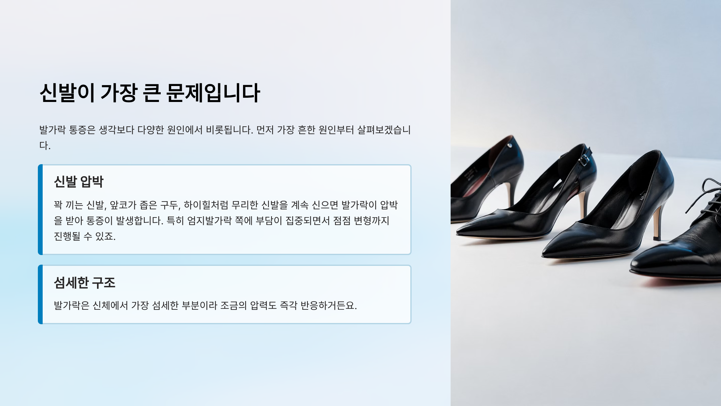 | 외부 압박 | 꽉 끼는 신발, 하이힐 | 지속적 통증, 변형 |
