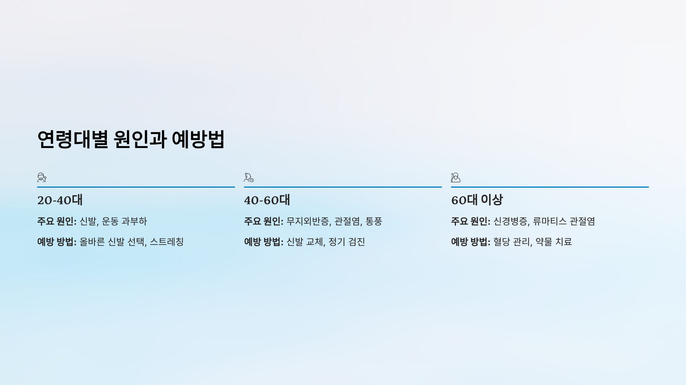 | 20-40대 | 신발, 운동 과부하 | 올바른 신발 선택, 스트레칭 |