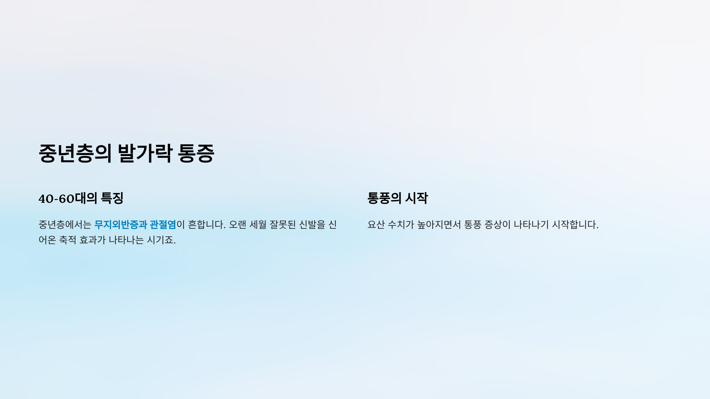 | 40-60대 | 무지외반증, 관절염, 통풍 | 신발 교체, 정기 검진 |