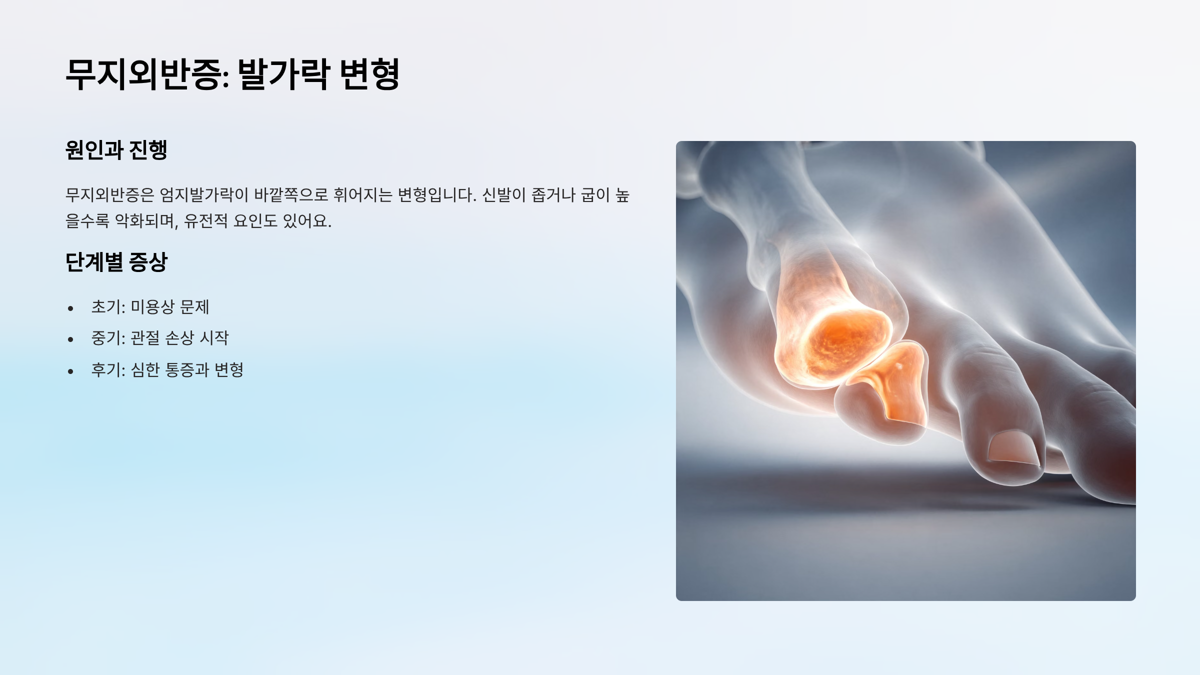 무지외반증은 엄지발가락이 바깥쪽으로 휘어지는 변형입니다. 신발이 좁거나 굽이 높을수록 악화되며, 유전적 요인도 있어요. 초기에는 미용상 문제일 뿐이지만, 시간이 지나면 관절이 손상되고 통증이 심해집니다.