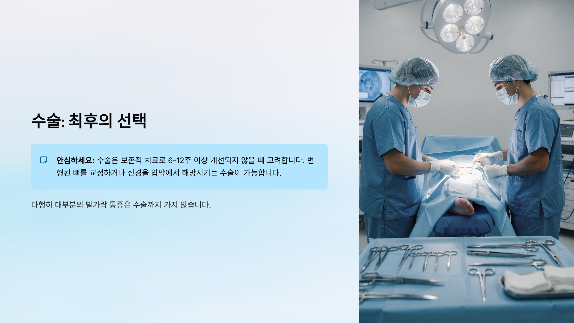 수술은 보존적 치료로 6-12주 이상 개선되지 않을 때 고려합니다. 변형된 뼈를 교정하거나 신경을 압박에서 해방시키는 수술이 가능합니다. 다행히 대부분의 발가락 통증은 수술까지 가지 않습니다.