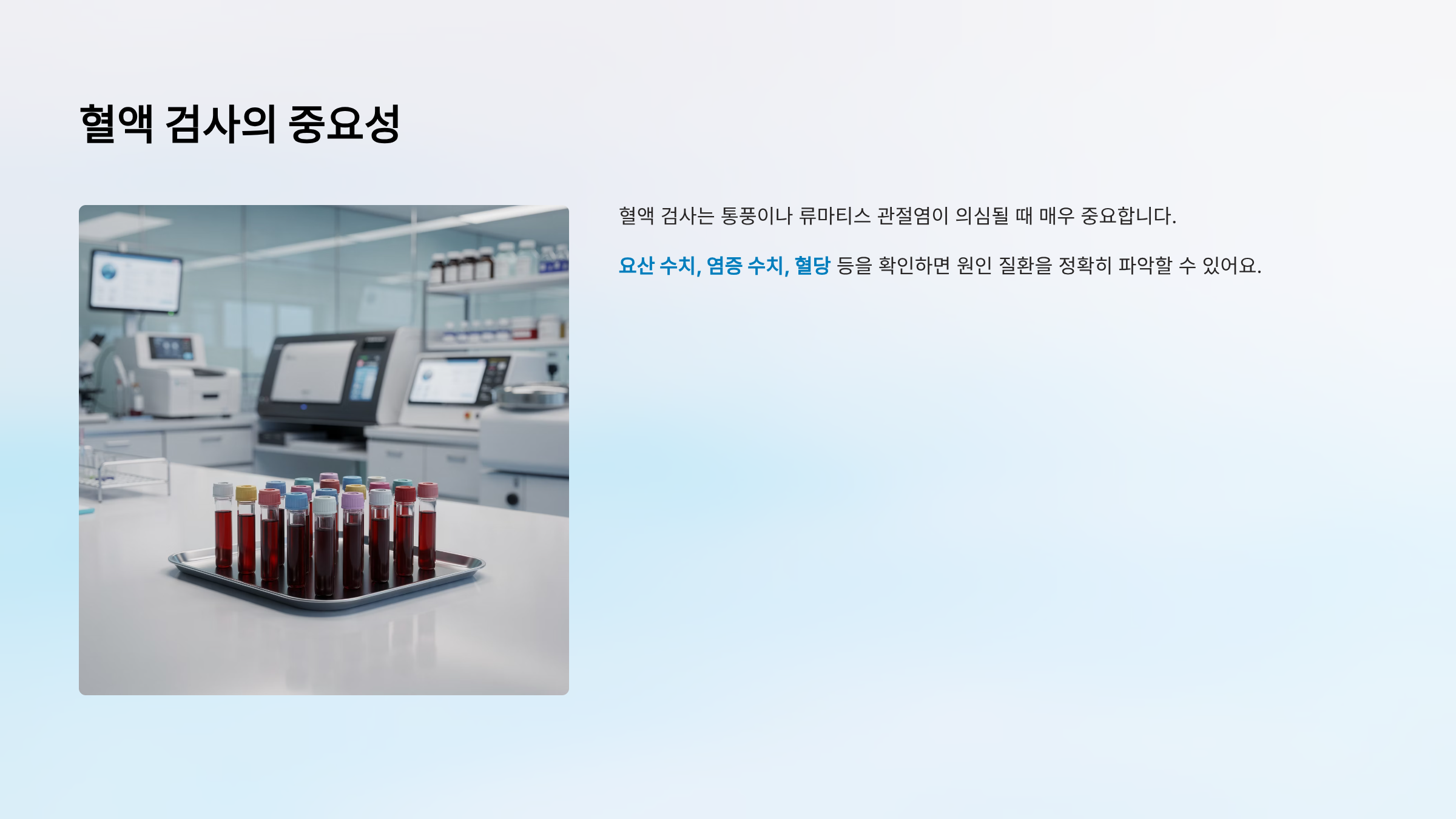 혈액 검사는 통풍이나 류마티스 관절염이 의심될 때 매우 중요합니다. 요산 수치, 염증 수치, 혈당 등을 확인하면 원인 질환을 정확히 파악할 수 있어요.
