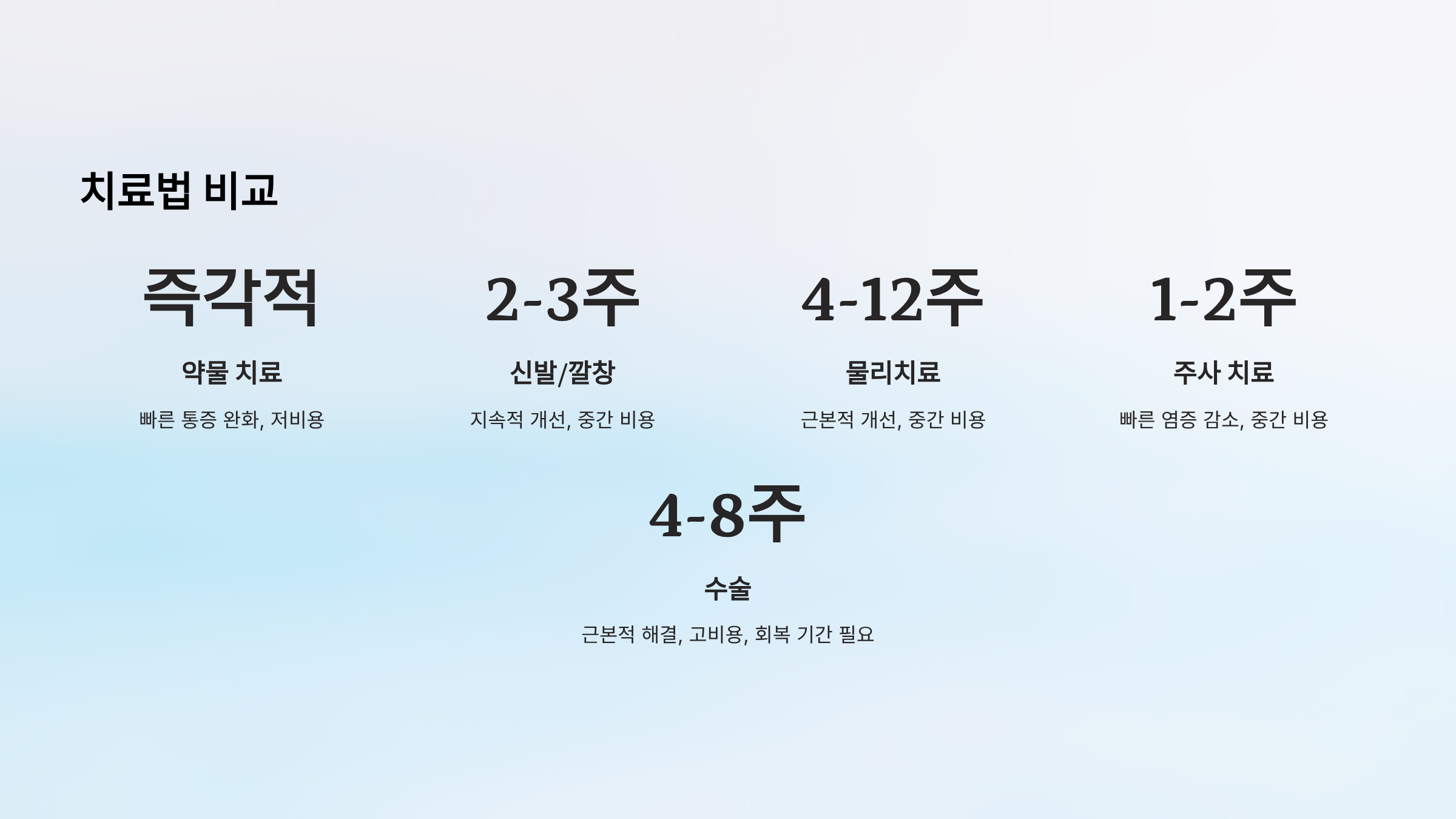 | 주사 치료 | 빠른 염증 감소 | 1-2주 | 중가 |