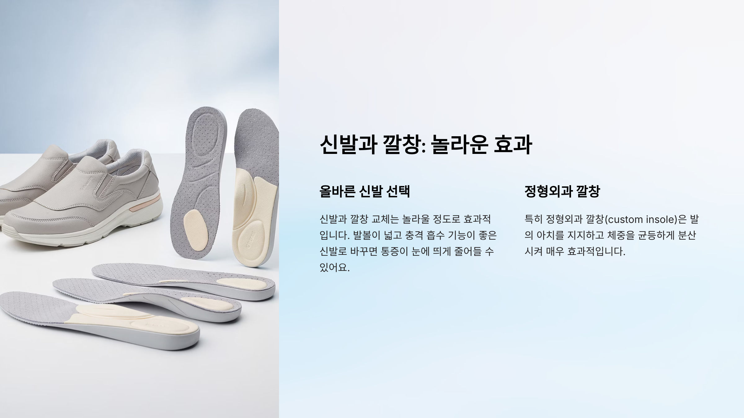 신발과 깔창 교체는 놀라울 정도로 효과적입니다. 발볼이 넓고 충격 흡수 기능이 좋은 신발로 바꾸면 통증이 눈에 띄게 줄어들 수 있어요. 특히 정형외과 깔창(custom insole)은 발의 아치를 지지하고 체중을 균등하게 분산시켜 매우 효과적입니다.