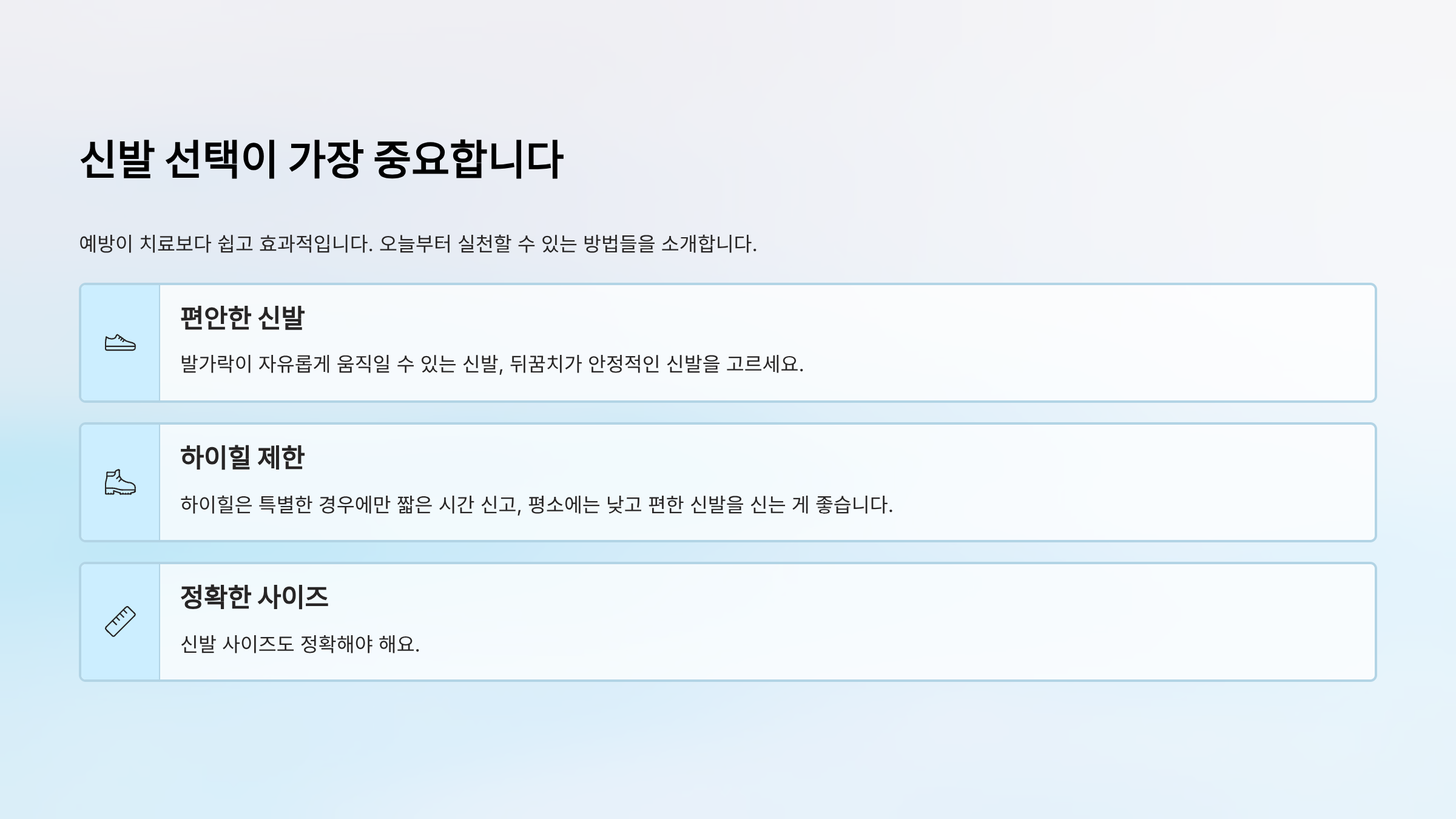 신발 선택이 가장 중요합니다. 발가락이 자유롭게 움직일 수 있는 신발, 뒤꿈치가 안정적인 신발을 고르세요. 하이힐은 특별한 경우에만 짧은 시간 신고, 평소에는 낮고 편한 신발을 신는 게 좋습니다. 신발 사이즈도 정확해야 해요.