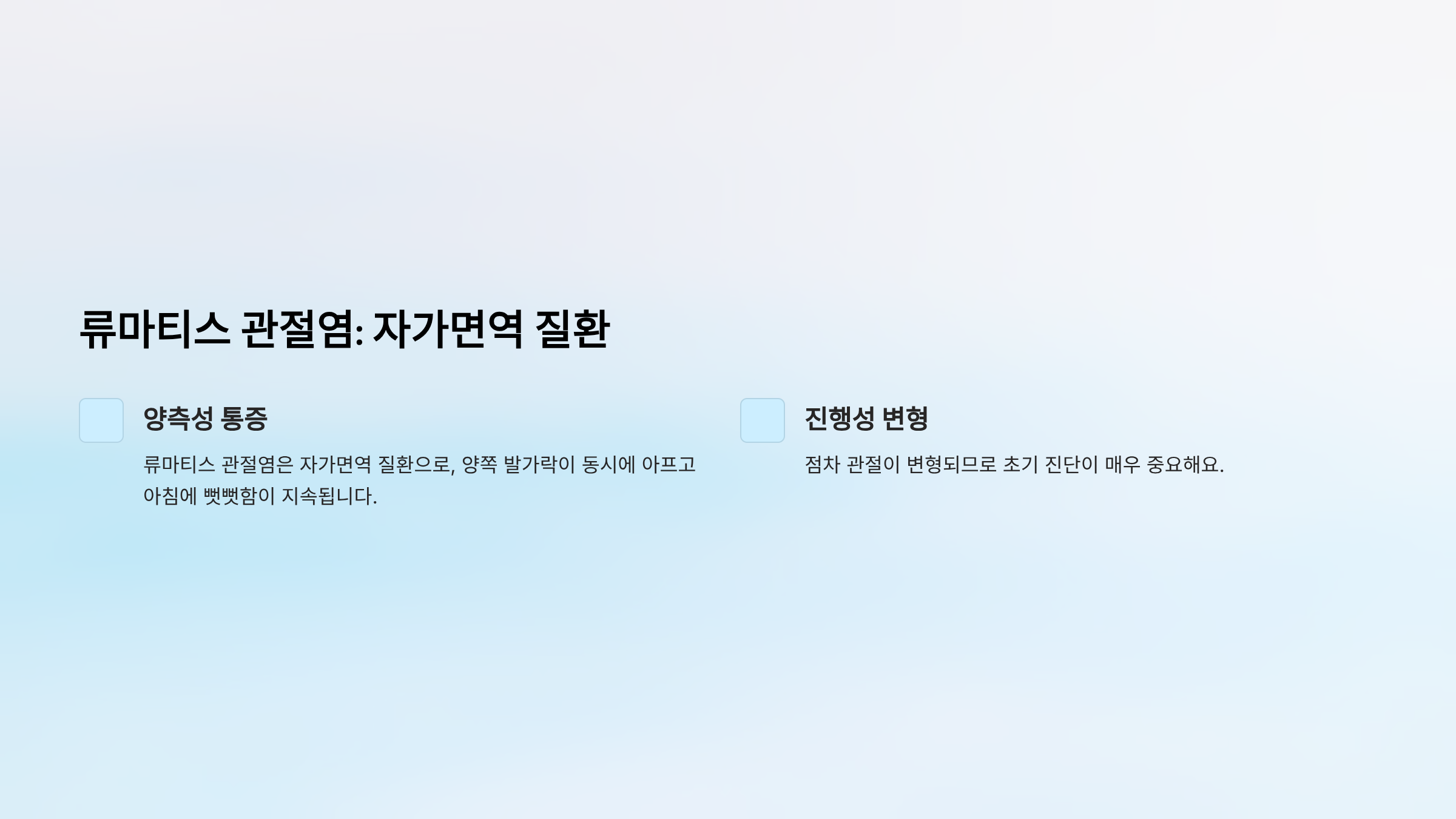 류마티스 관절염은 자가면역 질환으로, 양쪽 발가락이 동시에 아프고 아침에 뻣뻣함이 지속됩니다. 점차 관절이 변형되므로 초기 진단이 매우 중요해요.