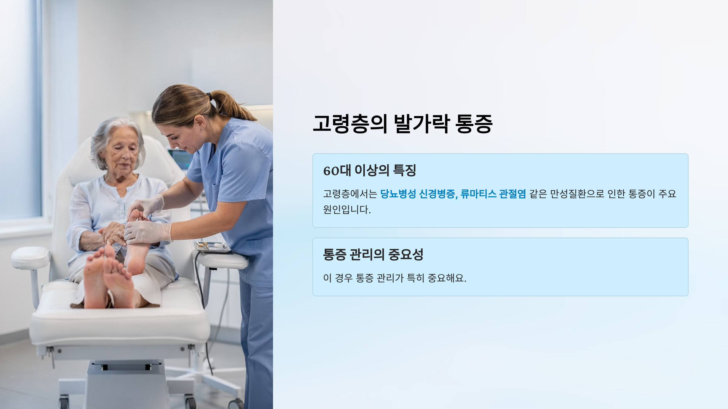 고령층(60대 이상)에서는 당뇨병성 신경병증, 류마티스 관절염 같은 만성질환으로 인한 통증이 주요 원인입니다. 이 경우 통증 관리가 특히 중요해요.