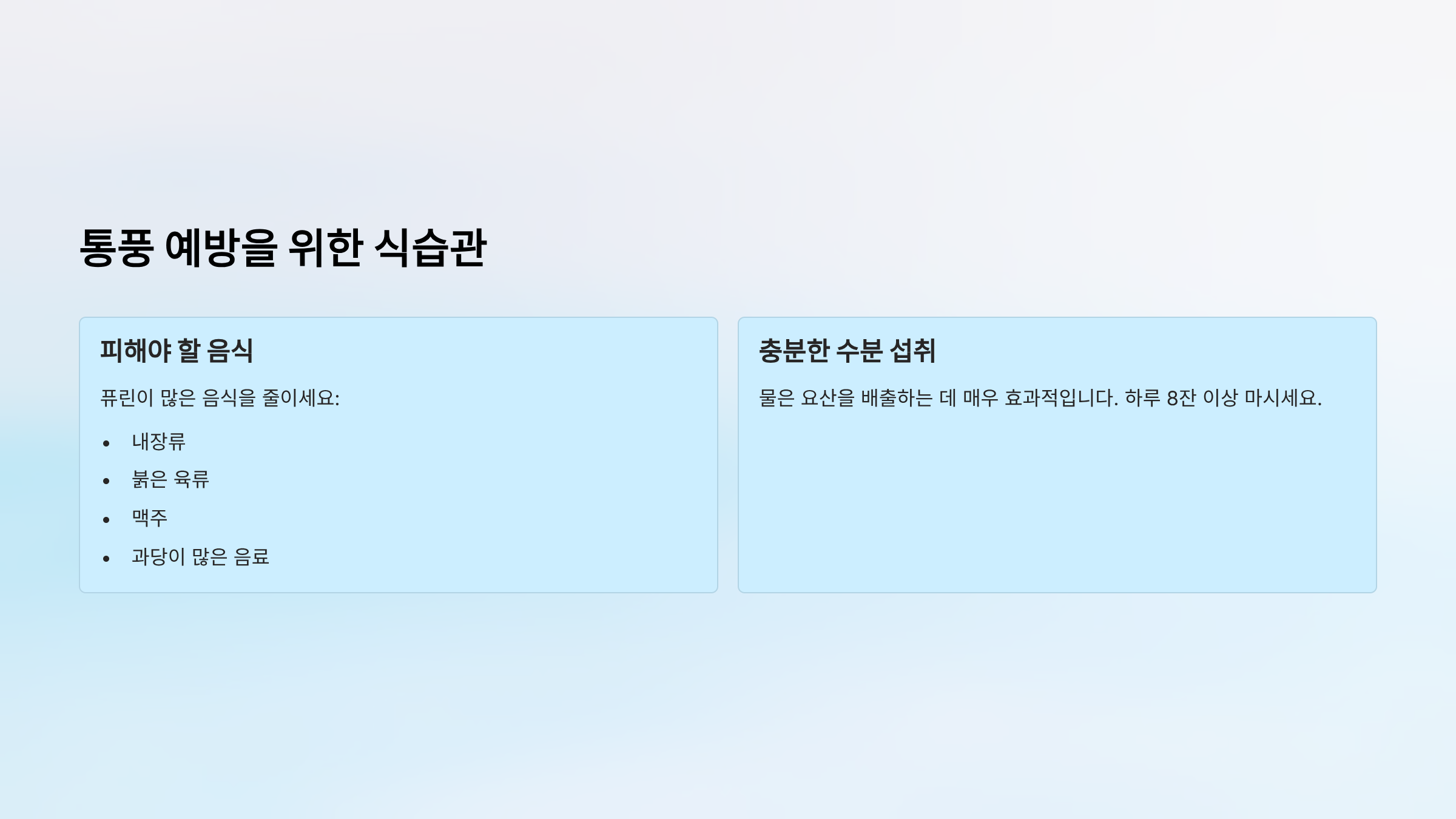 통풍 예방을 위해서는 식습관이 중요합니다. 퓨린이 많은 음식(내장류, 붉은 육류, 맥주, 과당이 많은 음료)을 줄이고, 충분한 물을 마세요. 물은 요산을 배출하는 데 매우 효과적입니다.