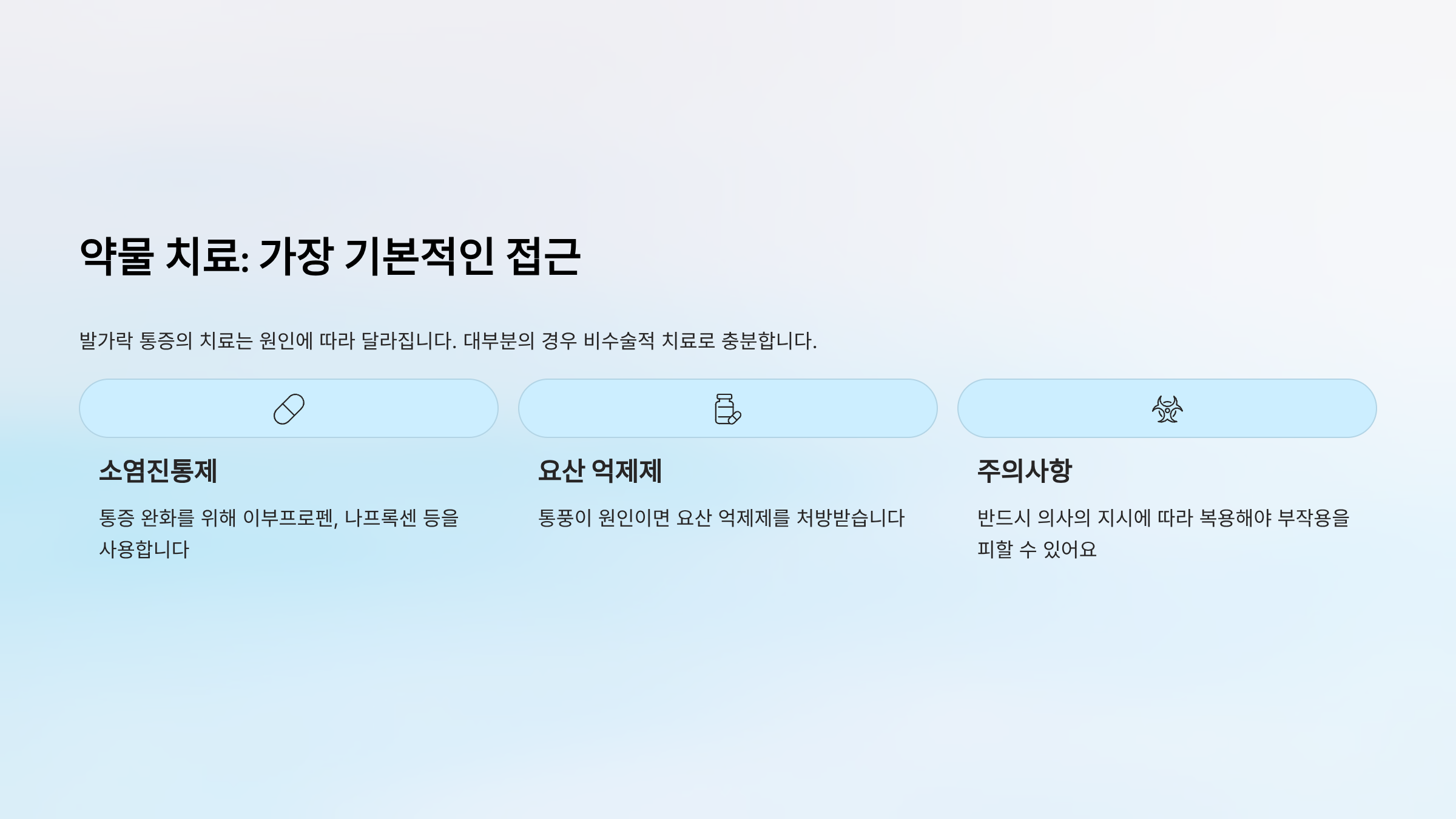 | 약물 치료 | 빠른 통증 완화 | 즉각적 | 저가 |