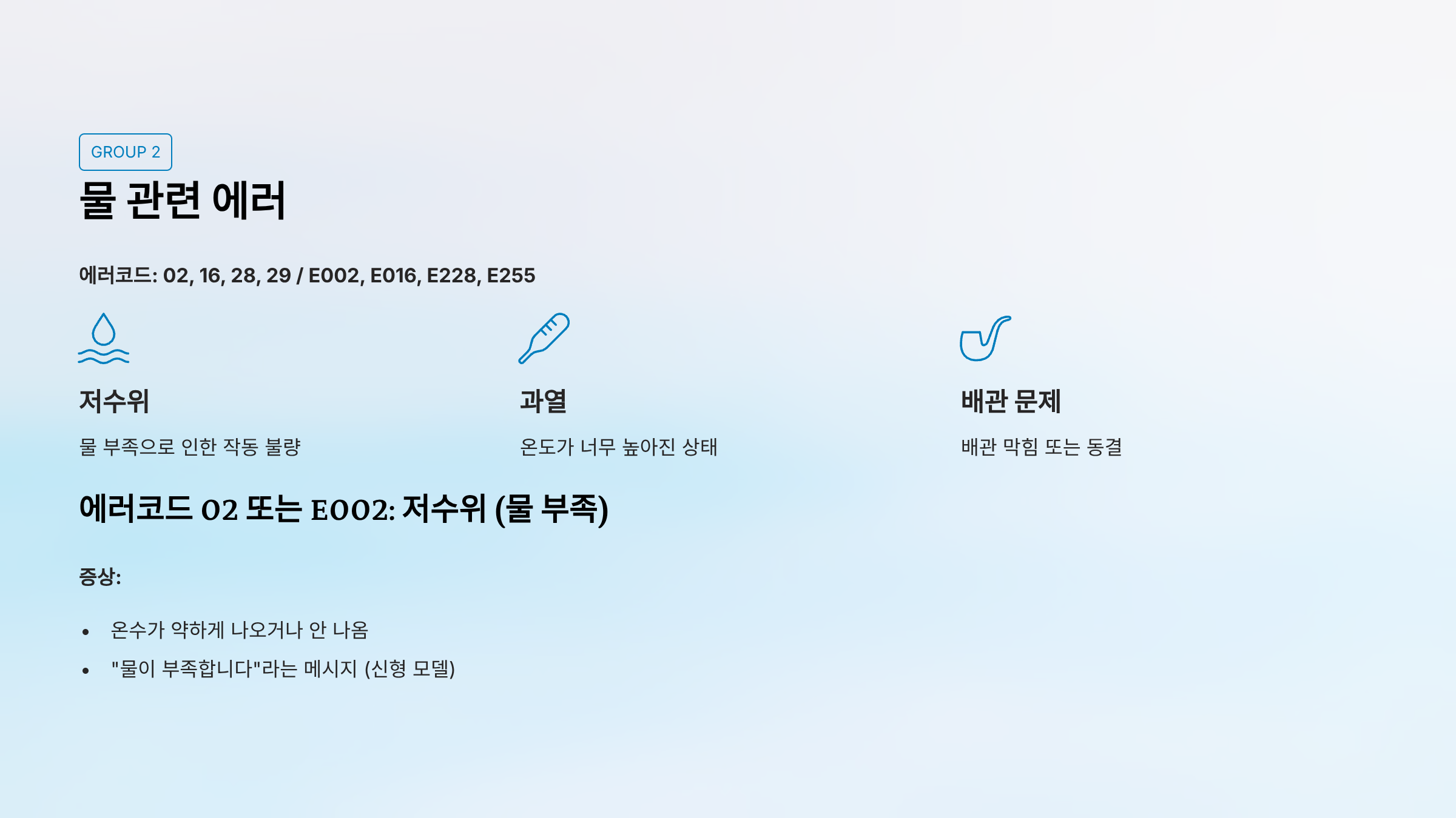 | 02/E002 | 저수위 | 물 부족, 직수밸브 잠김 | ✓ 가능 | △ 반복시 |