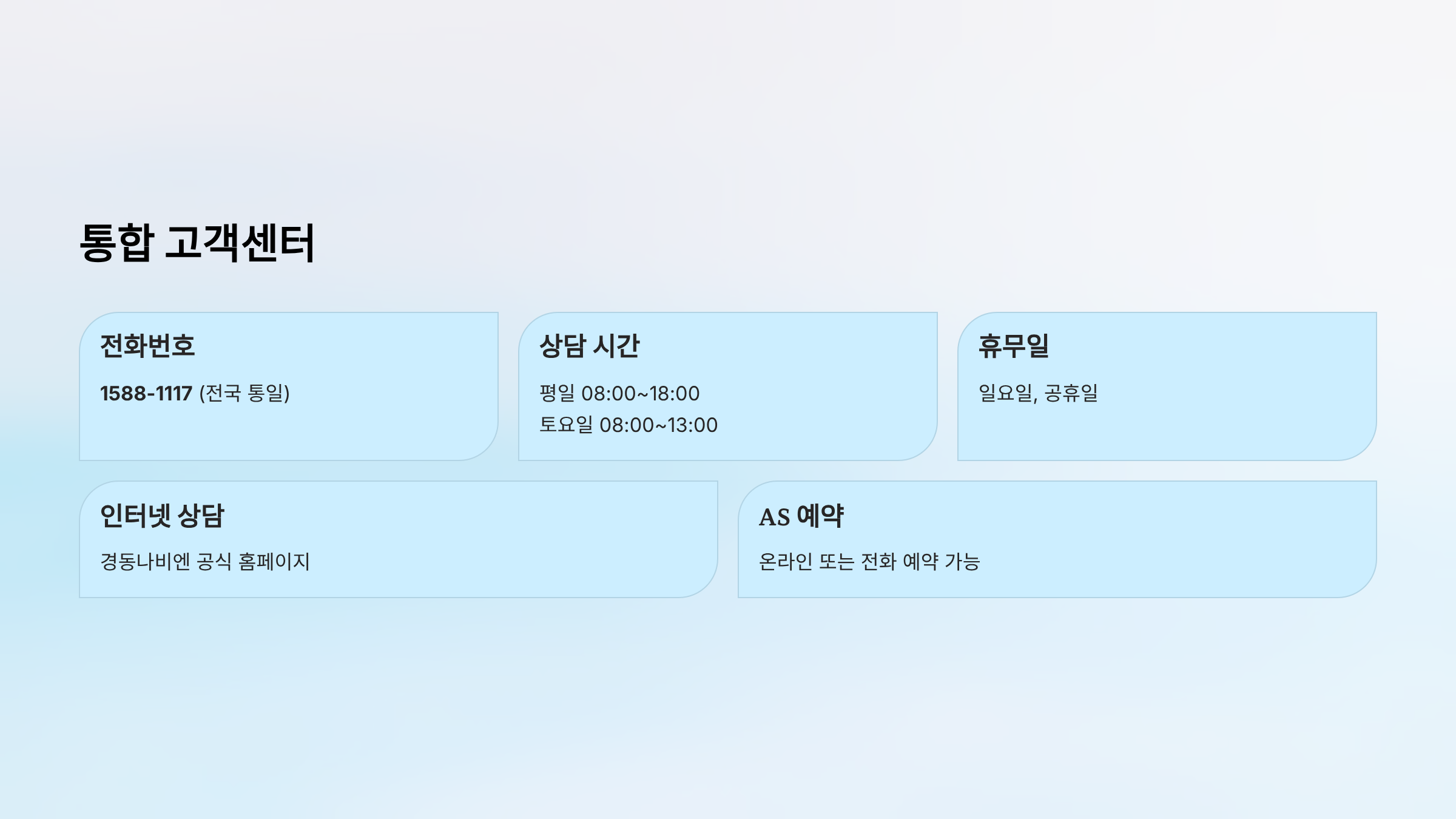 | 상담 시간 | 평일 08:00~18:00, 토요일 08:00~13:00 |