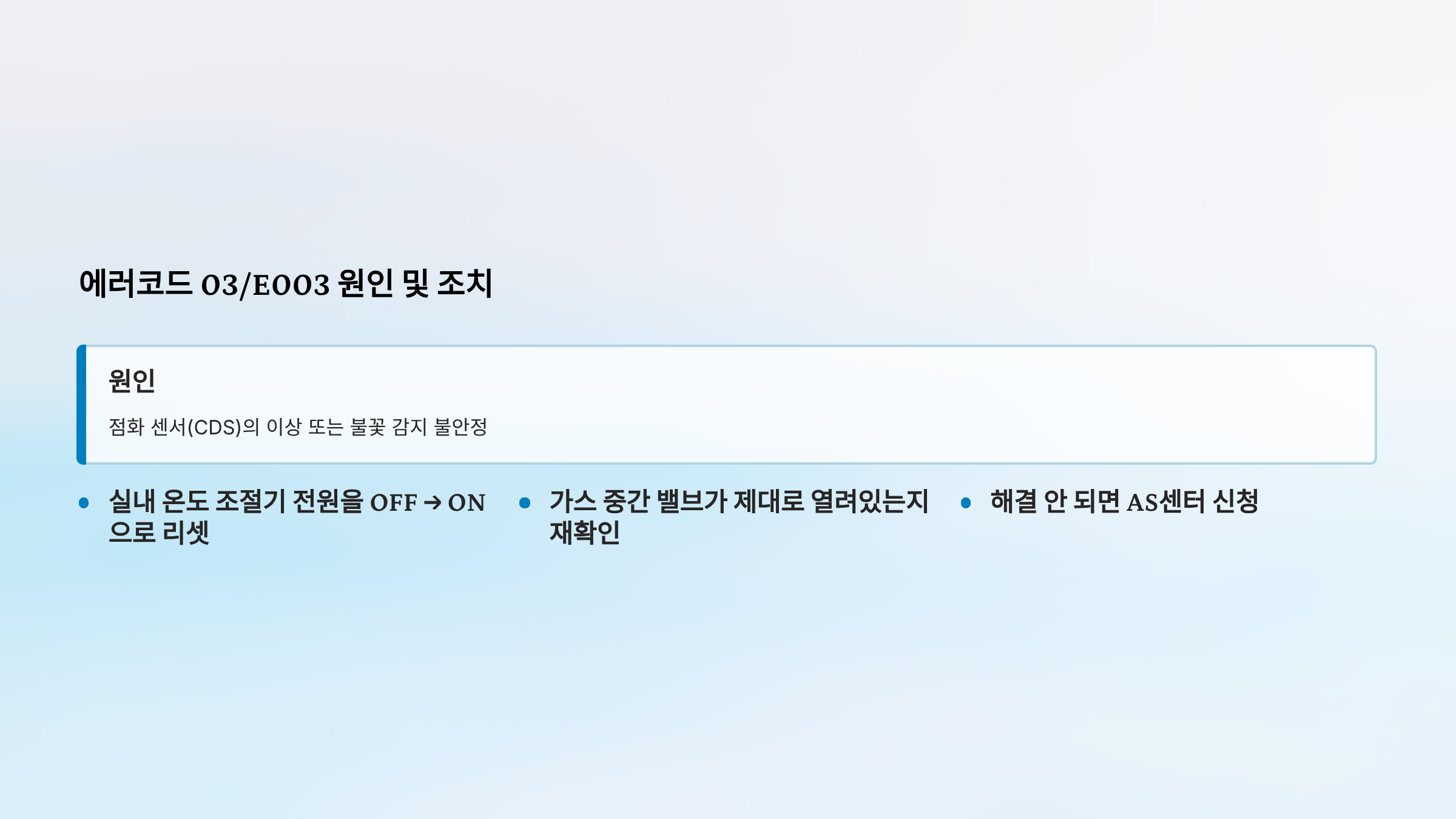 | 01/E001 | 불착화 | 가스 미공급 또는 점화 불량 | ✓ 가능 | △ 반복시 |