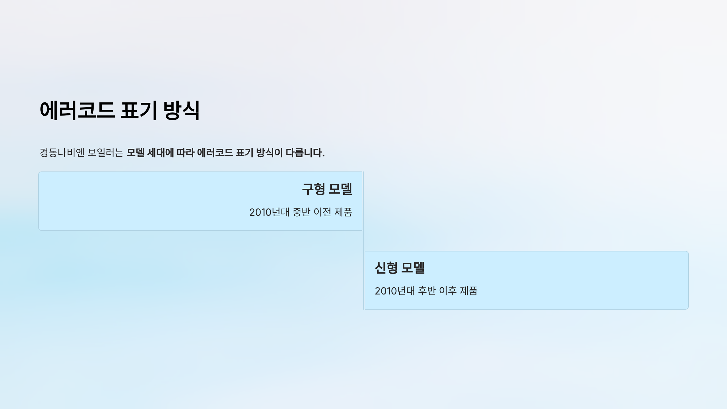 경동나비엔 보일러는 모델 세대에 따라 에러코드 표기 방식이 다릅니다.