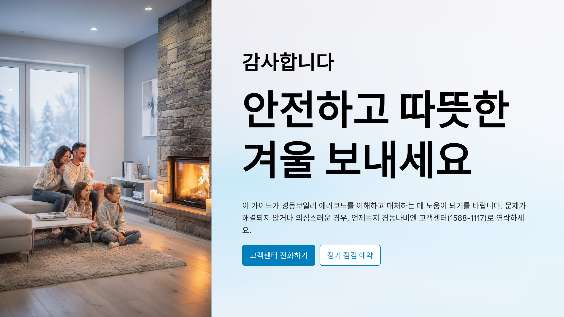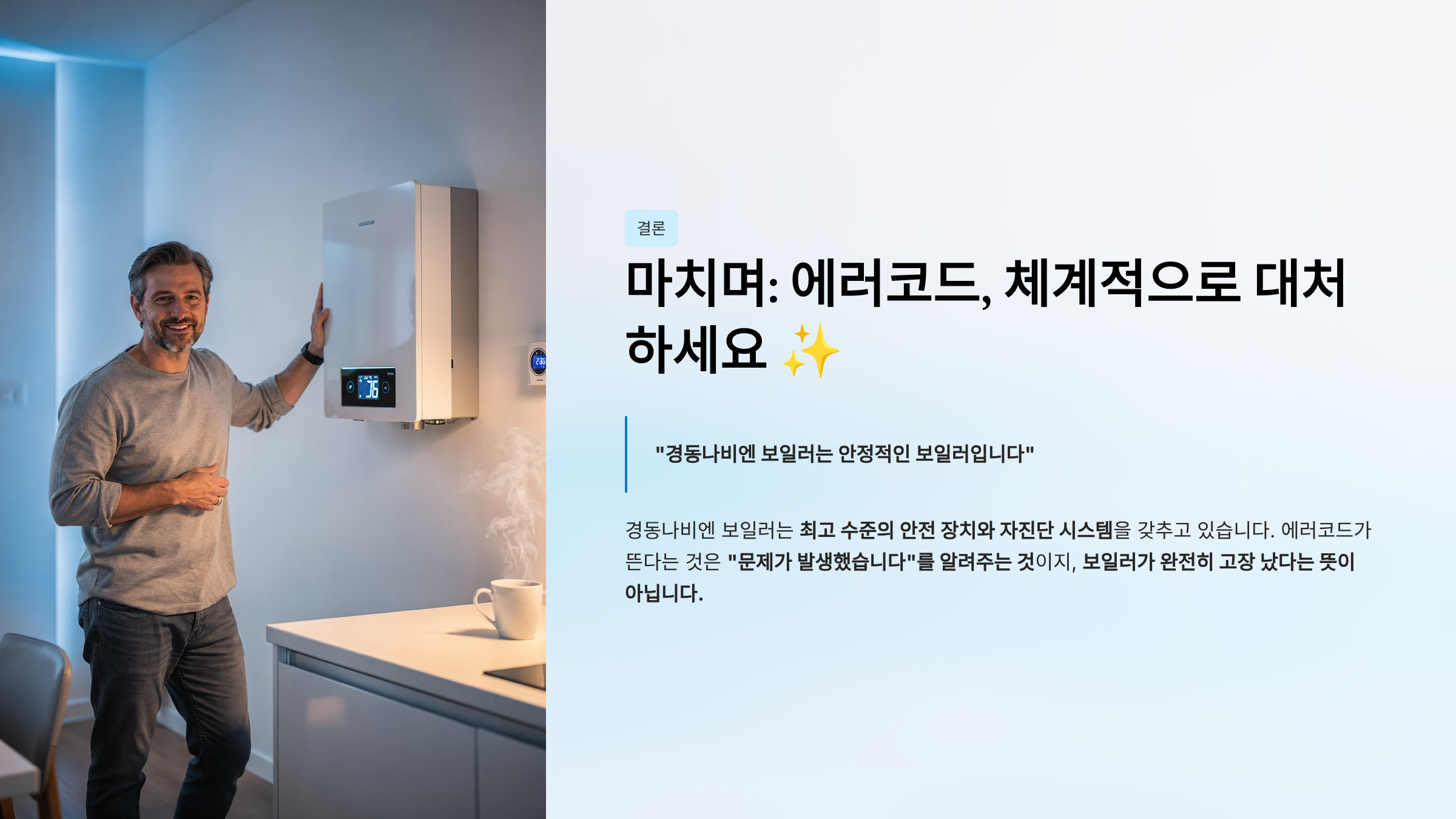 경동나비엔 보일러는 최고 수준의 안전 장치와 자진단 시스템을 갖추고 있습니다. 에러코드가 뜬다는 것은 "문제가 발생했습니다"를 알려주는 것이지, 보일러가 완전히 고장 났다는 뜻이 아닙니다.