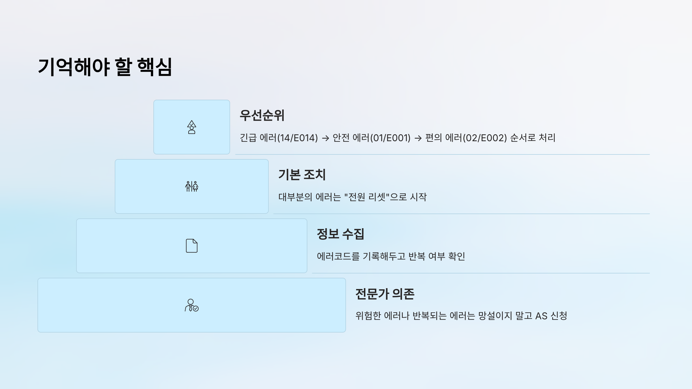 - 전문가 의존: 위험한 에러나 반복되는 에러는 망설이지 말고 AS 신청