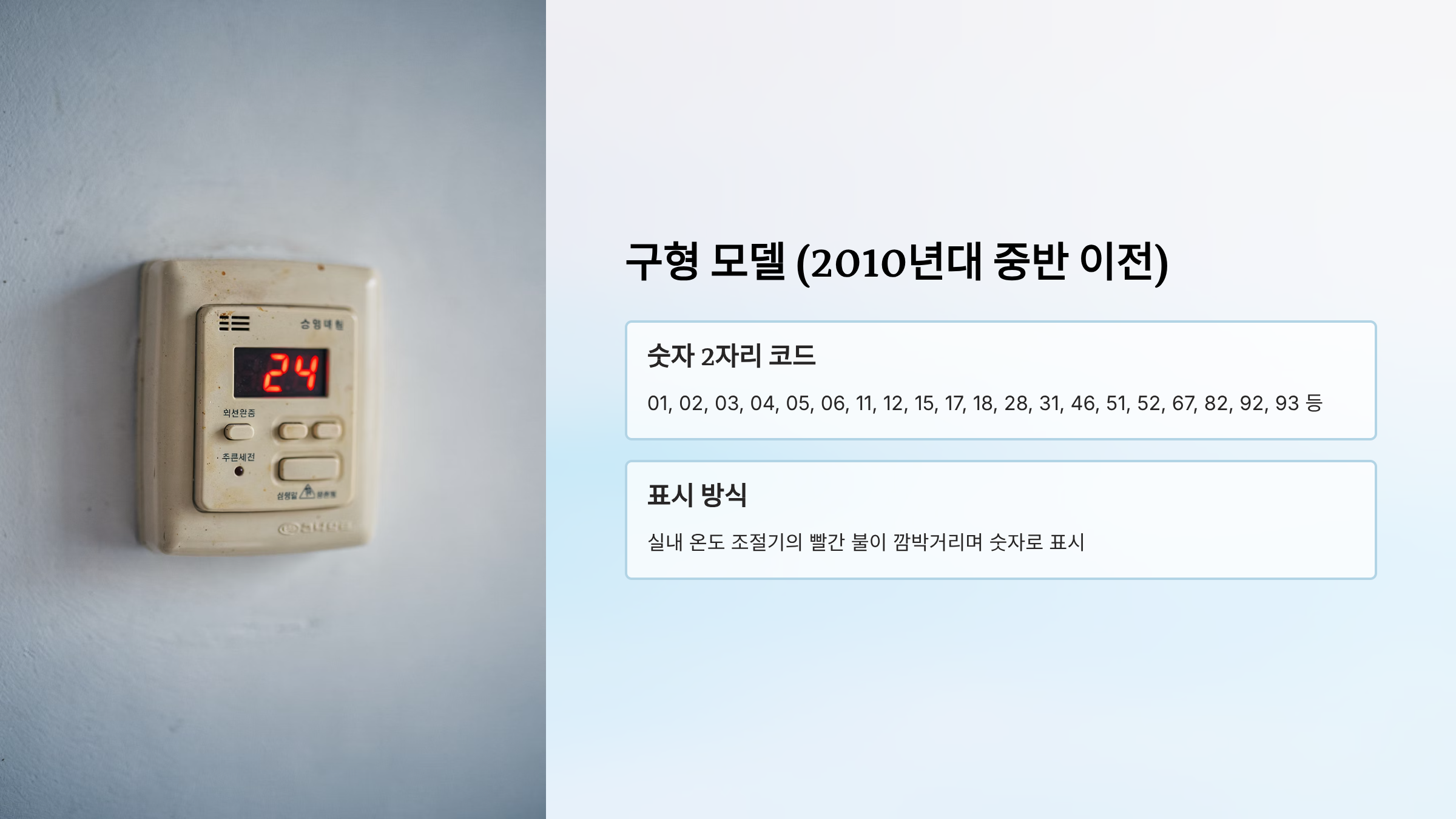 - 형식: 실내 온도 조절기의 빨간 불이 깜박거리며 숫자로 표시