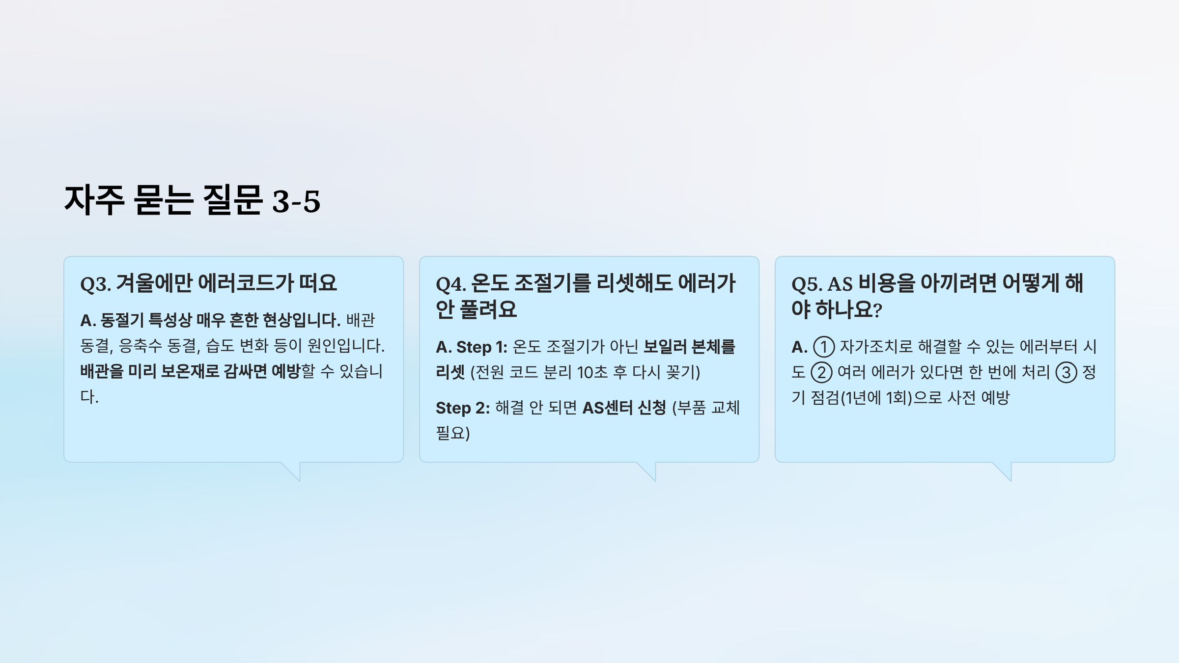A. 동절기 특성상 매우 흔한 현상입니다. 배관 동결, 응축수 동결, 습도 변화 등이 원인입니다. 배관을 미리 보온재로 감싸면 예방할 수 있습니다.