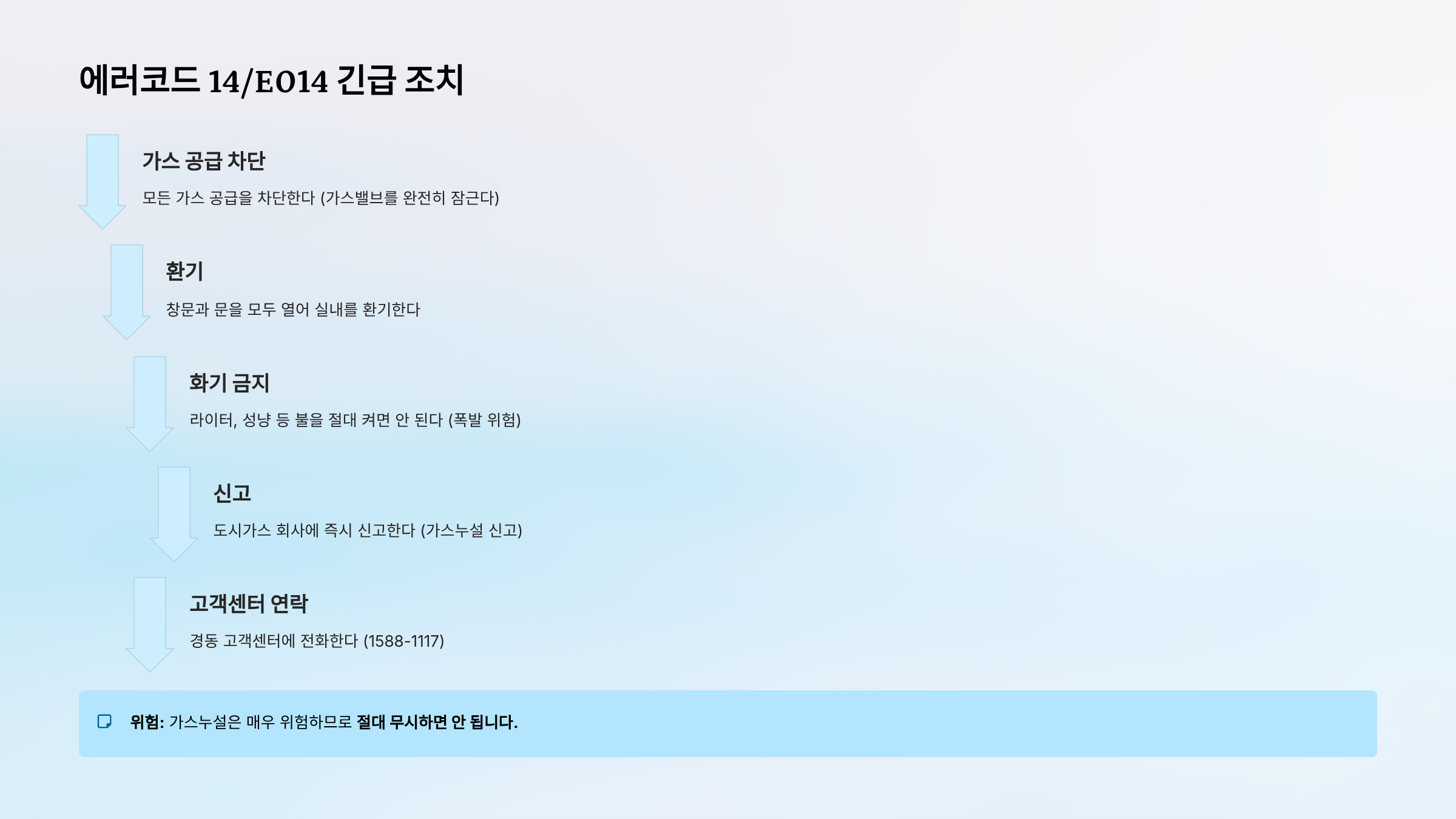| 14/E014 | 가스누설 | 실제 가스누설 | ✓ 긴급조치 | ✓ 필수 |
