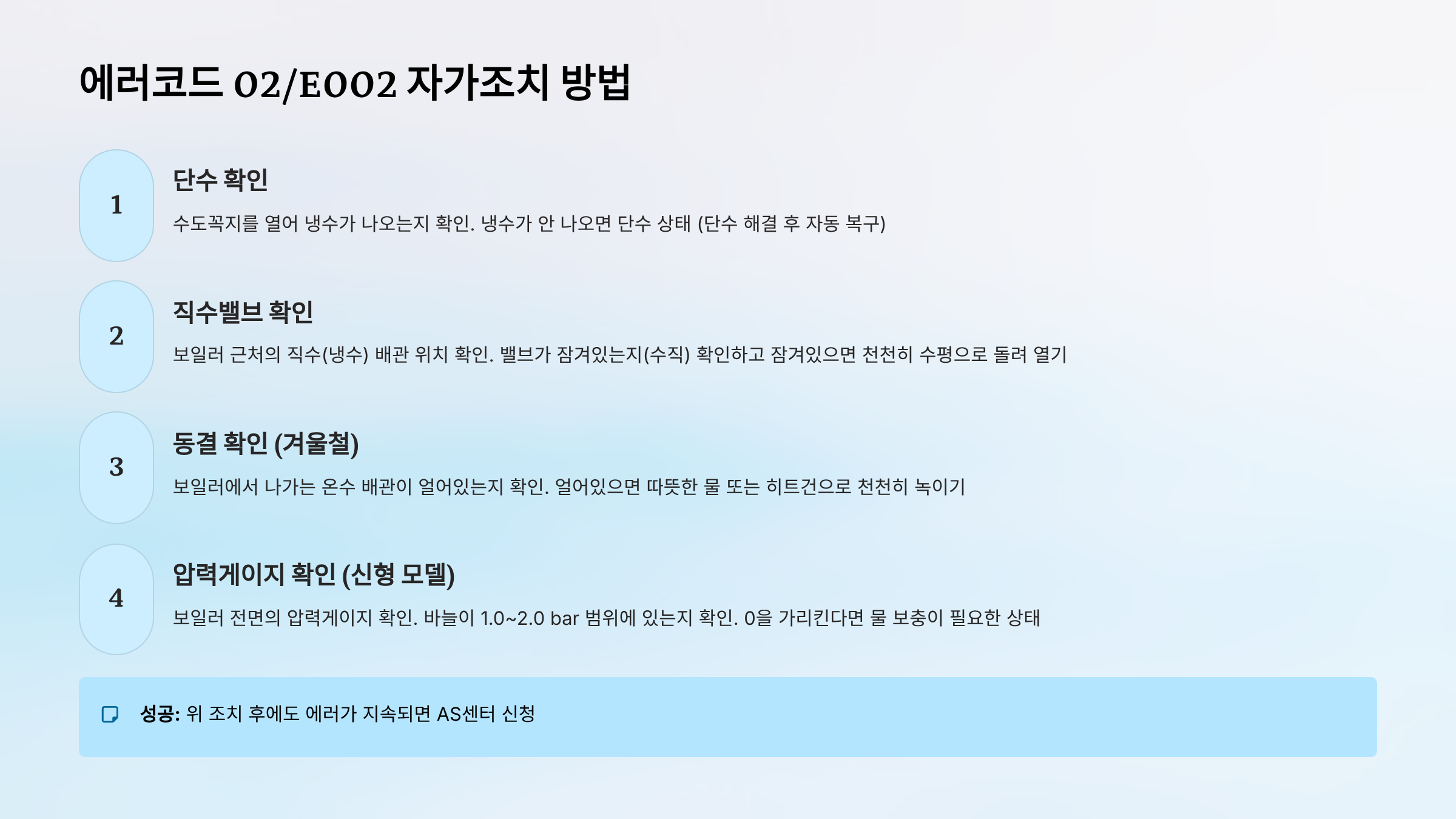 - 냉수가 안 나오면 → 단수 상태 (단수 해결 후 자동 복구)