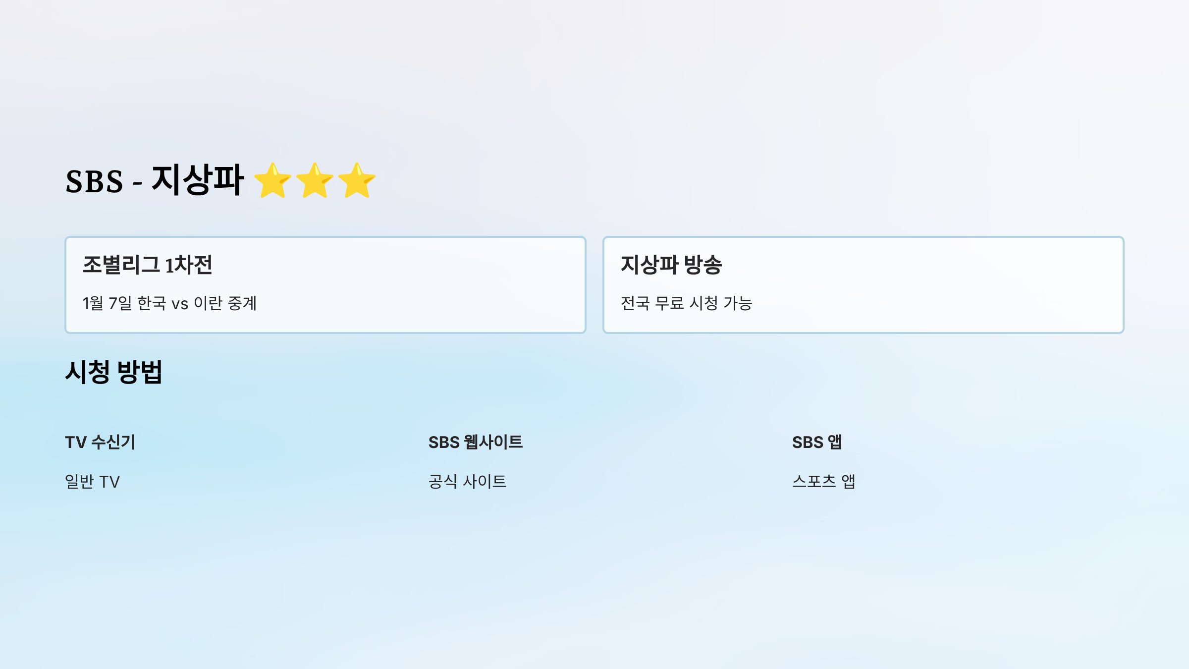 - 1차전 (1월 7일): 한국 vs 이란 → SBS