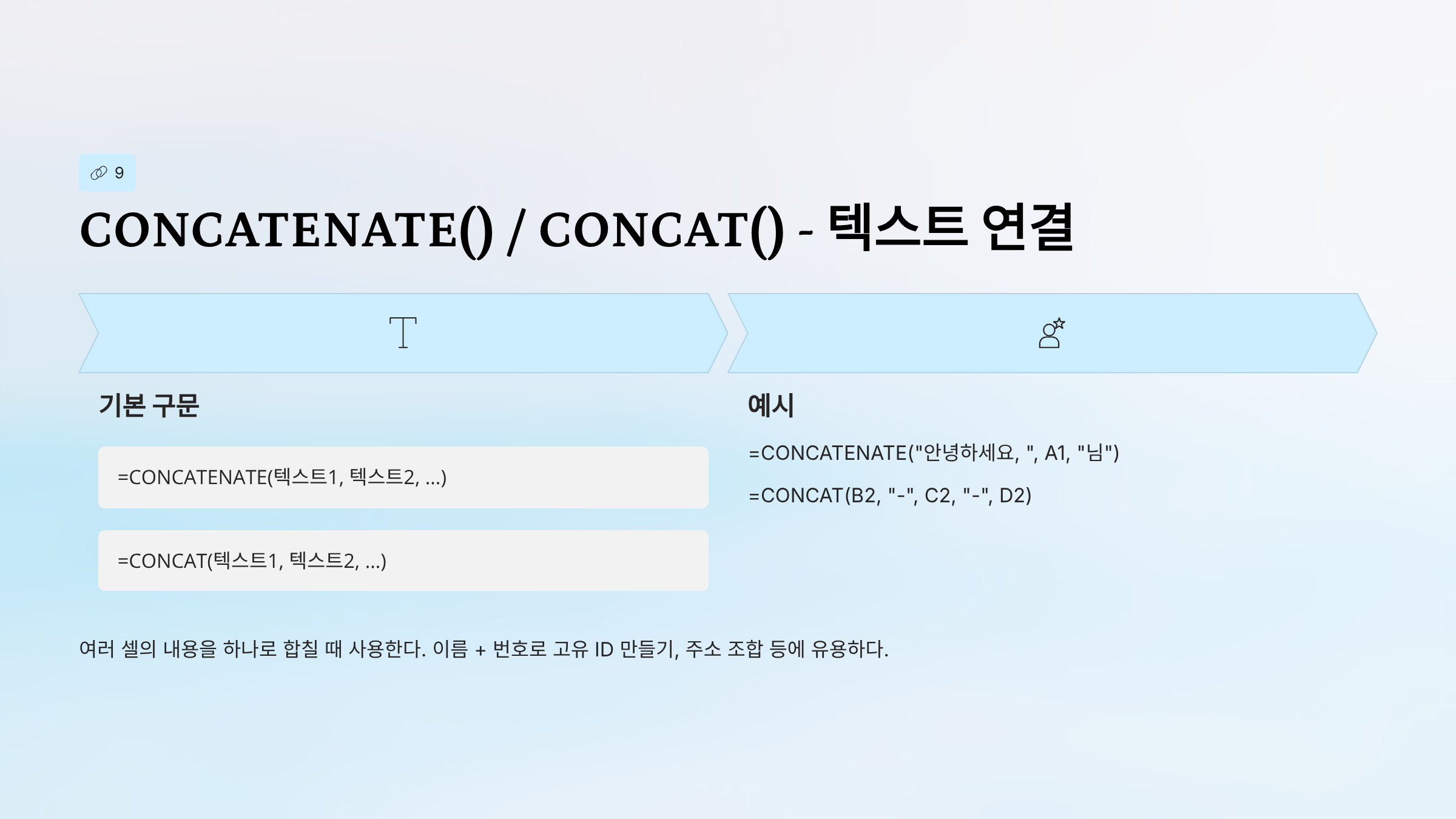 9️⃣ CONCATENATE() / CONCAT() - 텍스트 연결