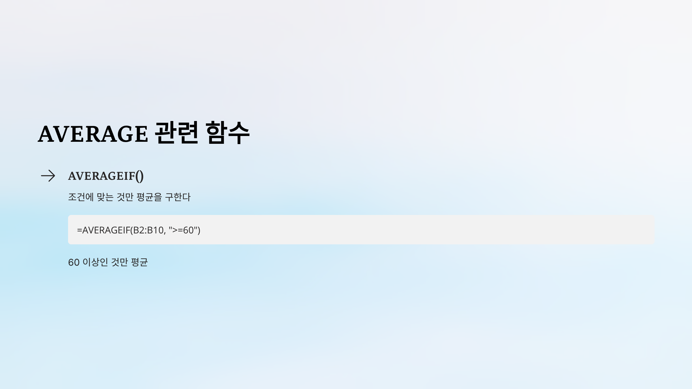 text=AVERAGEIF(B2:B10, ">=60") → 60 이상인 것만 평균