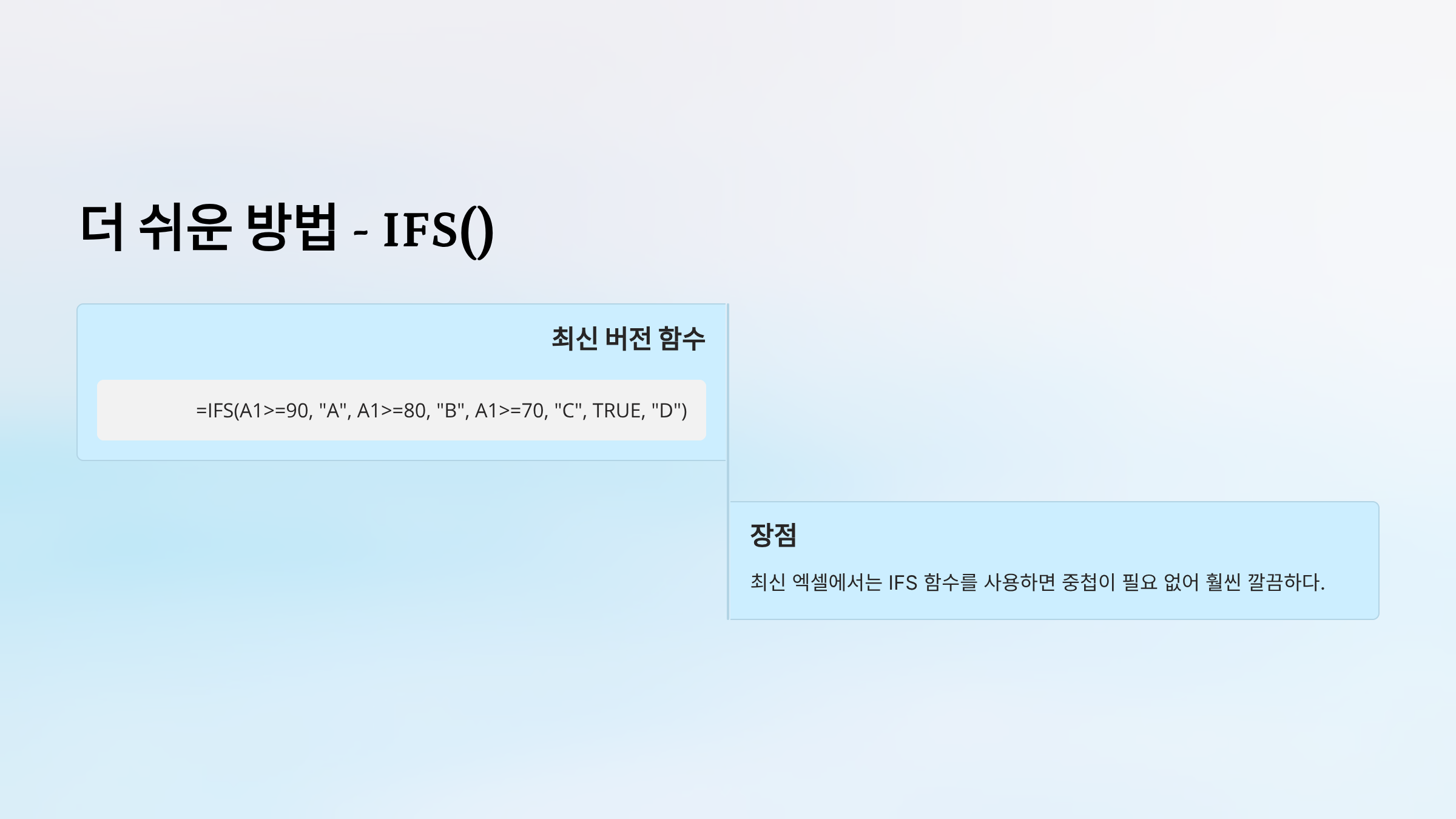 최신 엑셀에서는 IFS 함수를 사용하면 중첩이 필요 없어 훨씬 깔끔하다.